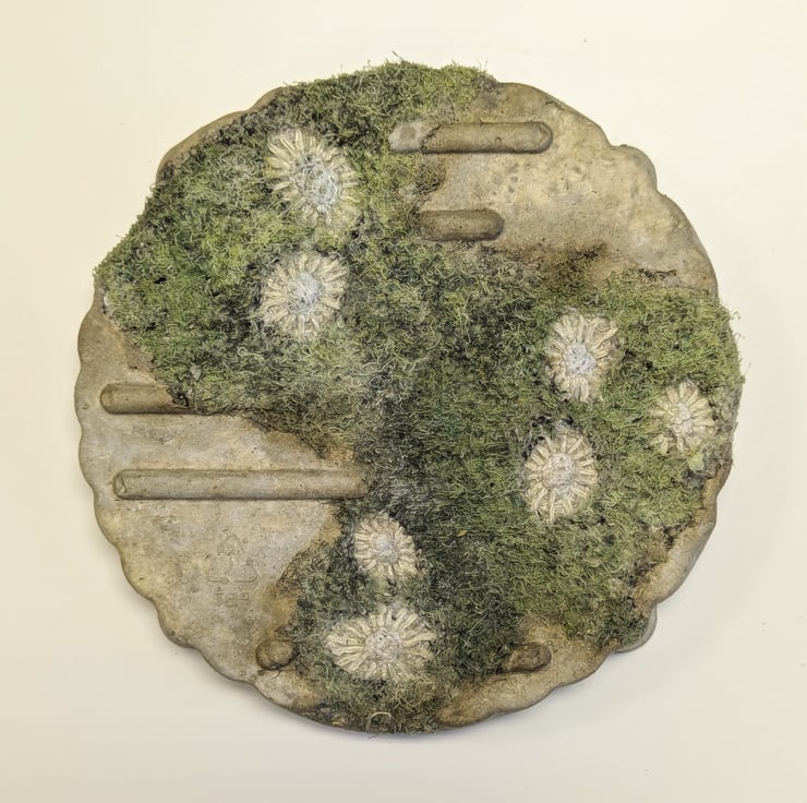 My work investigates change over time, not just eroding or decaying but new layers of growth, giving juxtapositions of structure and colour. Recent work highlights the issue of plastic pollution and the permanence of disposables through sculptures that combine embellished textiles and cement cast in plastic waste, inviting us to consider the packaging that we use and discard on a daily basis; objects that are so lightweight and seem so insignificant that we barely notice them. Naturally inspired textures emphasise the way our waste becomes subsumed into the natural world around us.