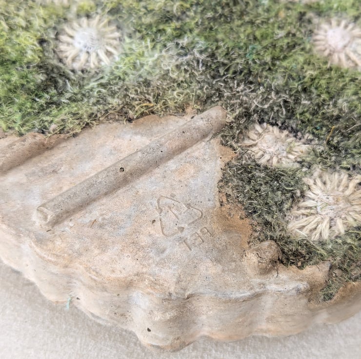 Embellished and embroidered recycled fabric inspired by coastal textures cast with papercrete inside plastic waste packaging. Mounted on recycled wood with D rings or mirrorplate for wall hanging or suitable for display on a plate stand.