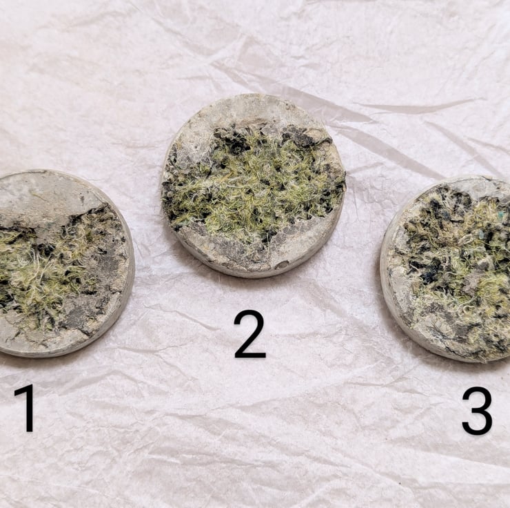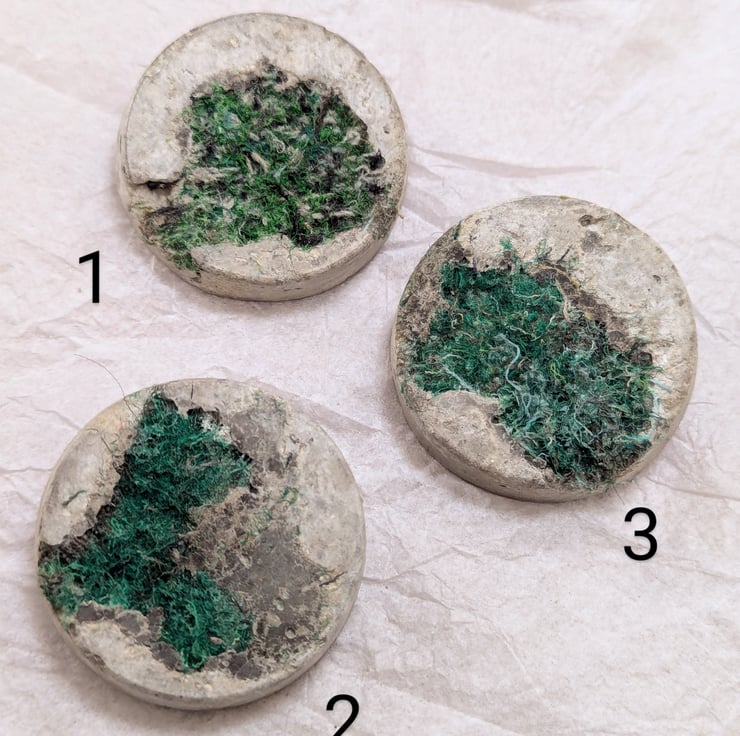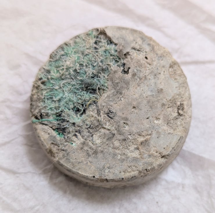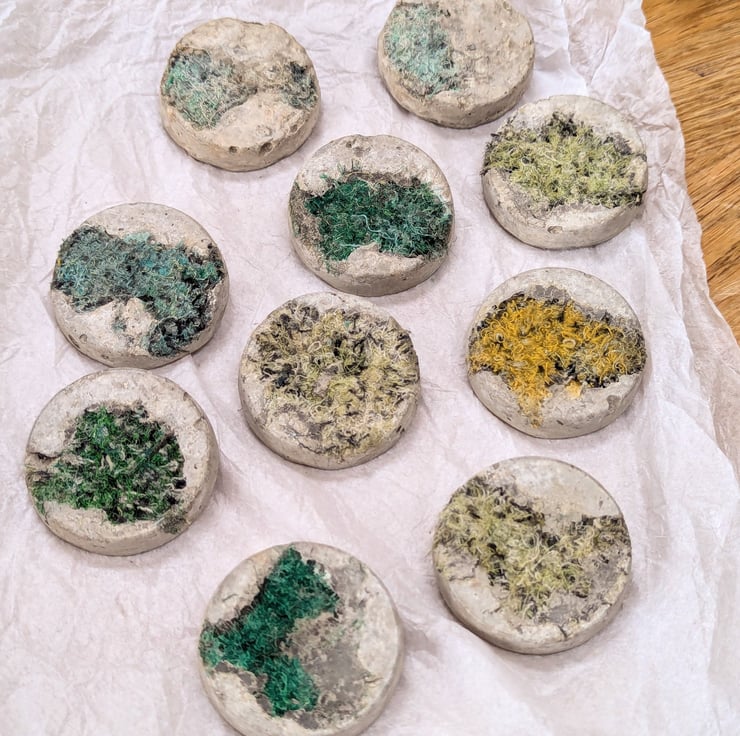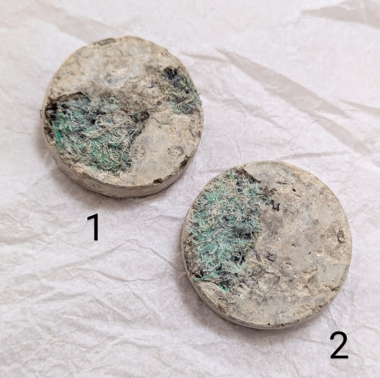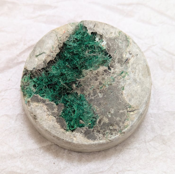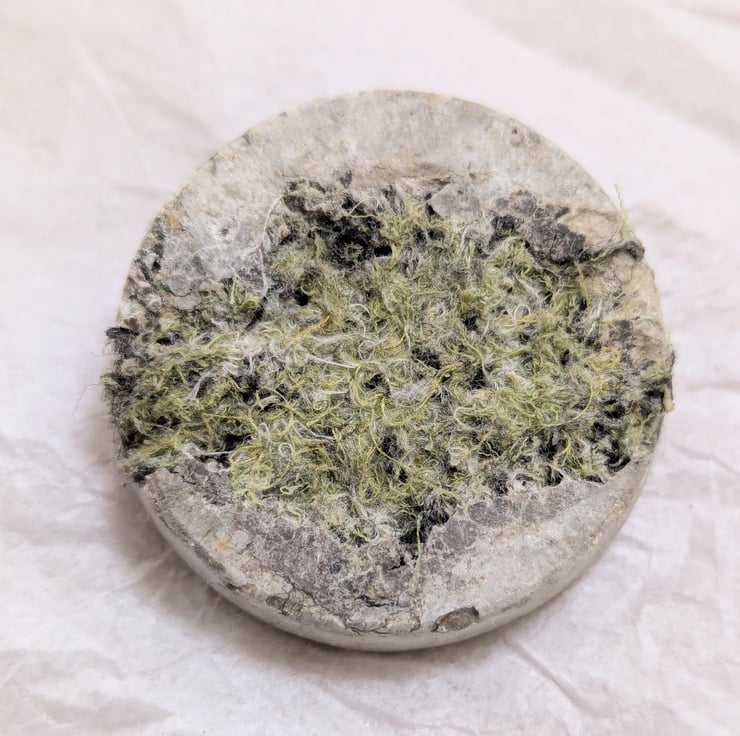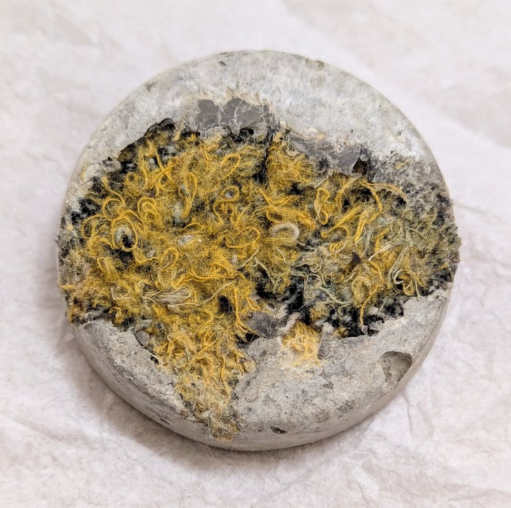To limit my waste, I turn my colourful textile offcuts into jewellery. I combine the embellished textiles with leftover concrete when casting sculptures. Just like my sculptures, they are cast in plastic food packaging giving the resulting brooches a bold contrast of textures. These brooches are 50mm across and taper slightly to the front. Each unique brooch has a standard safety clasp back attached using epoxy resin.
