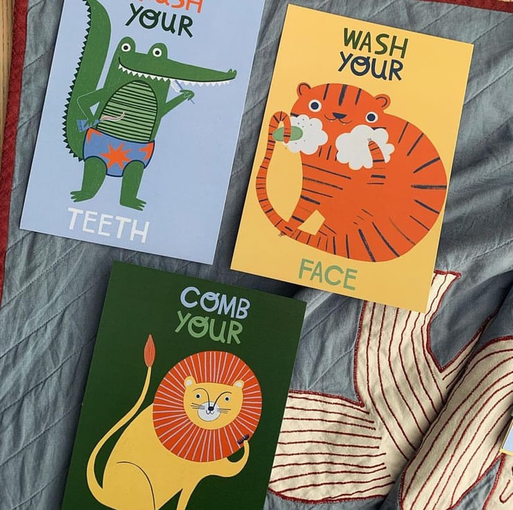 A set of three illustrated prints to hang in a bathroom or bed room. I made these to encourage my children to get ready more independently and they look fab framed in a bathroom!
