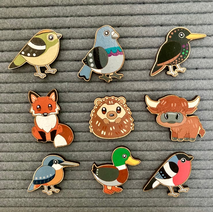 All pin badges have been designed,laser cut and hand painted at home.