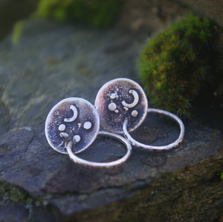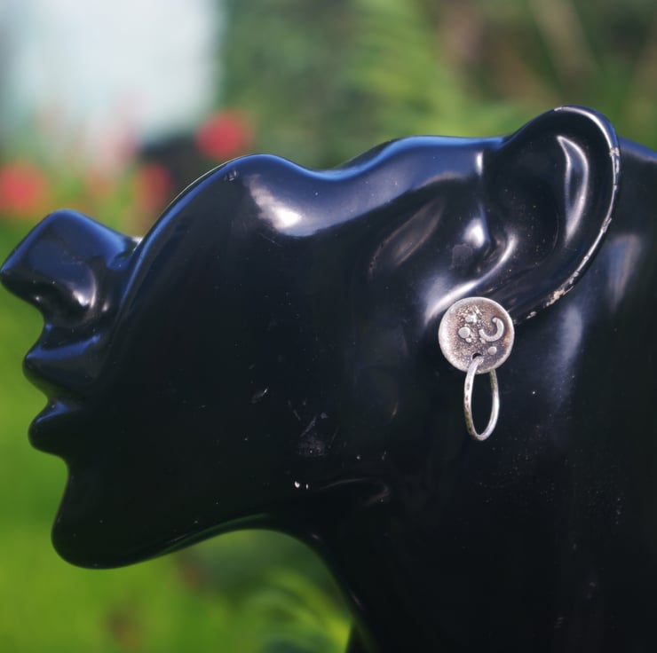Textured, sterling silver earrings, inspired by natural textures with textured hoops threaded through the the bottom. The circular discs sit on the earlobe and the texture has been achieved by fusing left over bits of silver to the surface. The hoops are textured with a small hammer. The textures have been accentuated by oxidisation , which is preserved with a penetrating wax.