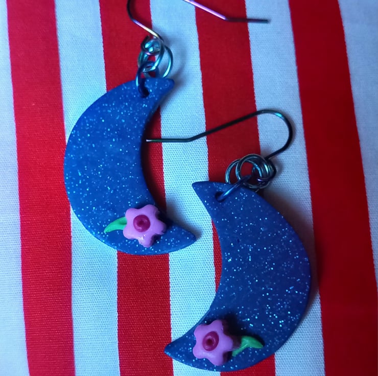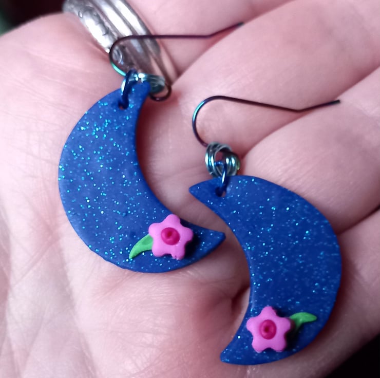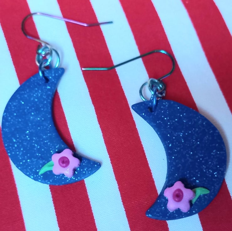 Sparkly moon shaped earrings with pink flower details. The findings are mixed metal, duo chrome earwires.