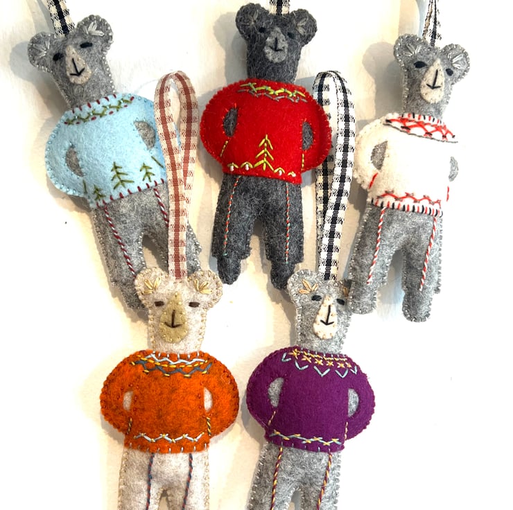 All of my makes are eco friendly and made to last from 100% wool felt and stuffed with washed wool fleece sourced from Yorkshire. I use DMC cotton thread to embroider folk patterns and stitches creating totally unique heirloom treasures.
