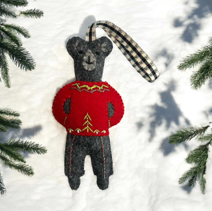The traditional Fair Isle pattern curved yoke of the jumper is embroidered with DMC cotton thread. I’ve attached a loop of ribbon to make it possible to hang on a tree or anywhere you like!