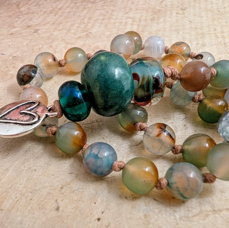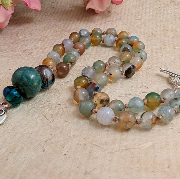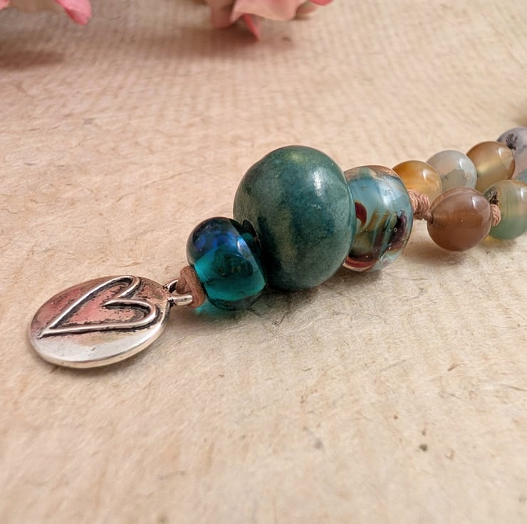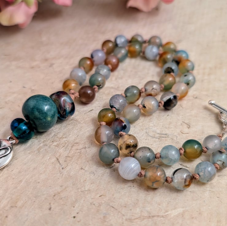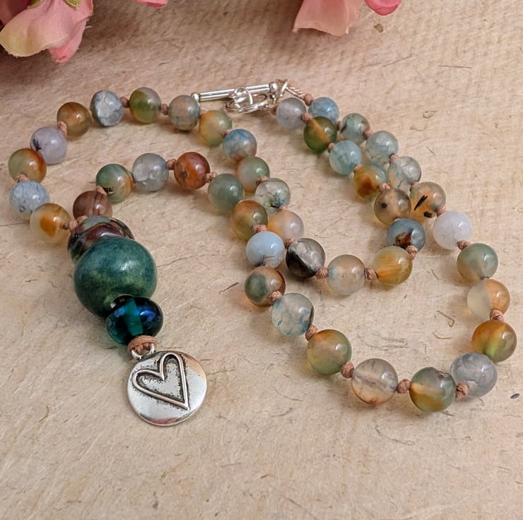 This necklace features a selection of agate semi precious beads in soft shades of blue, green and brown. At the focal point you'll find a large ceramic bead, with smaller lampwork glass beads either side. Beneath these hangs a silver coloured charm with a heart motif. Everything has been knotted onto cotton cord and a toggle clasp has been used as a fastener.