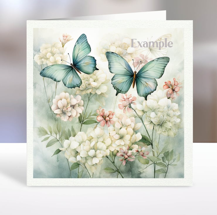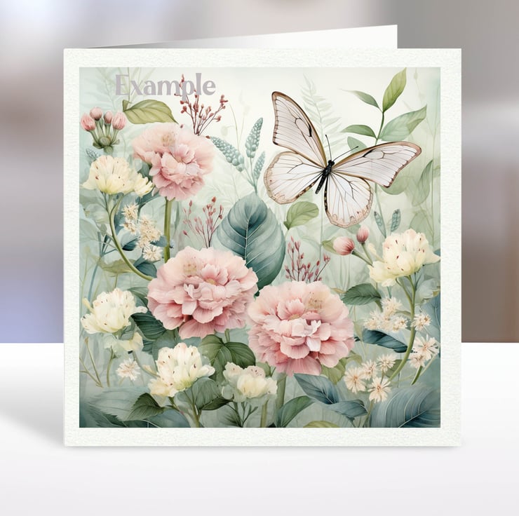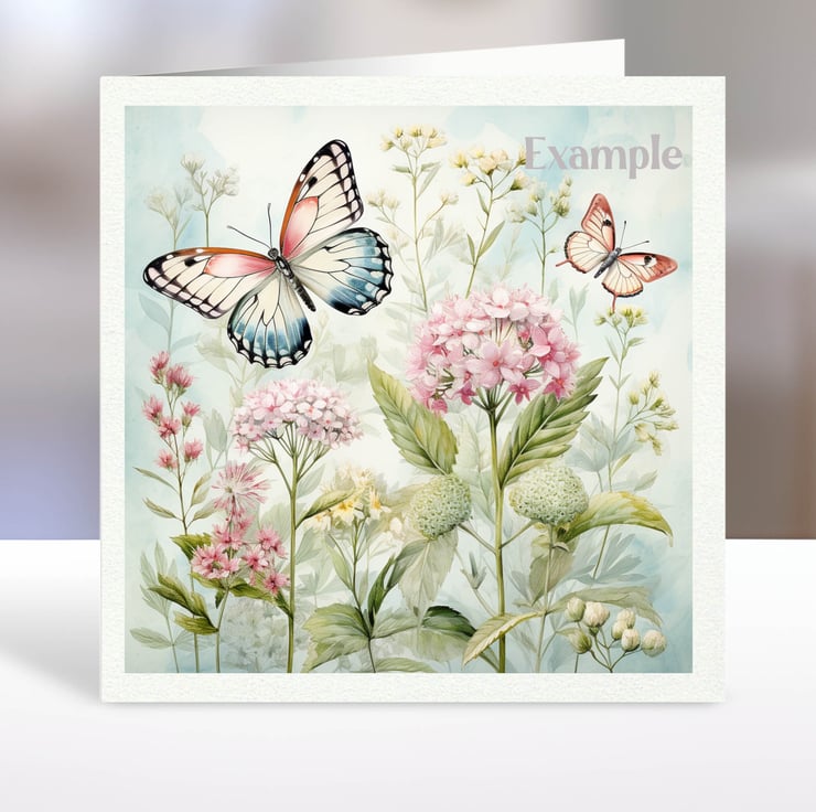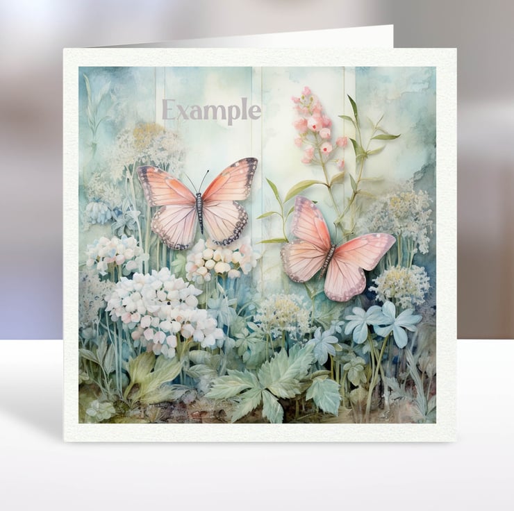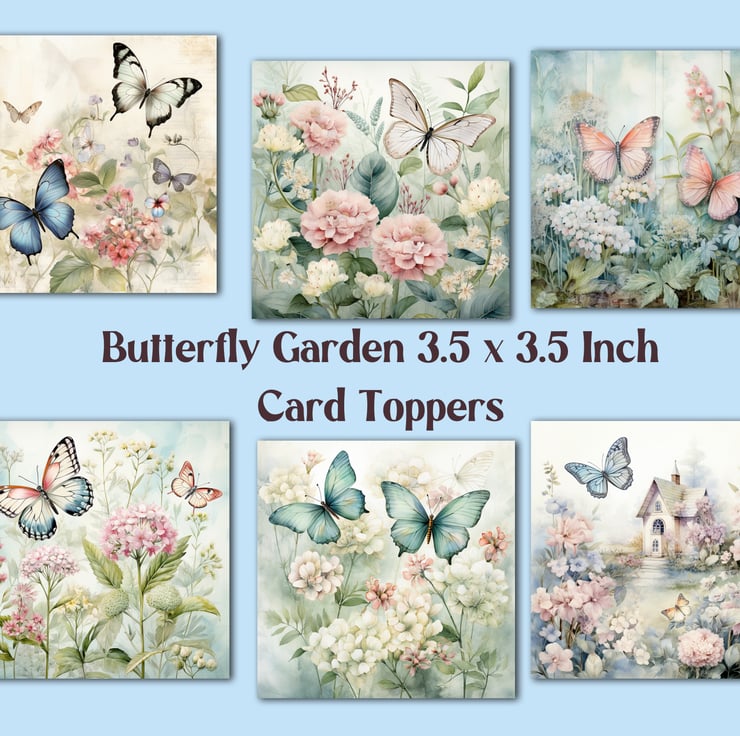 A set of six 3.5 inch square card toppers - Butterfly garden - butterflies and flowers in pastel shades with a vintage feel