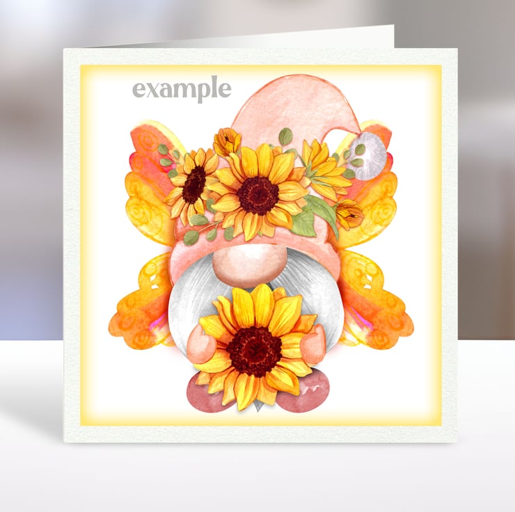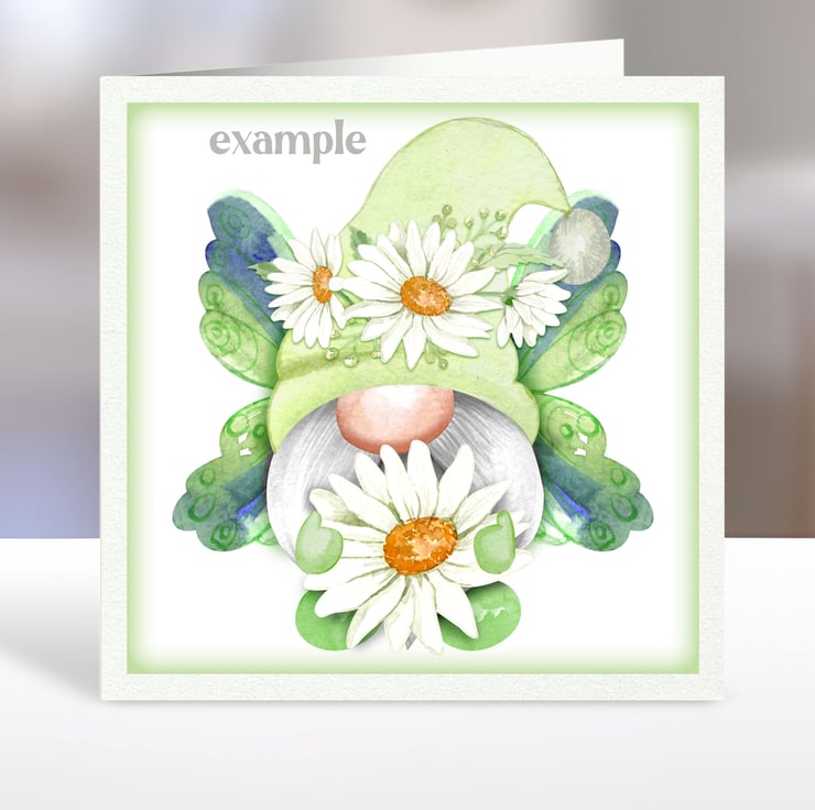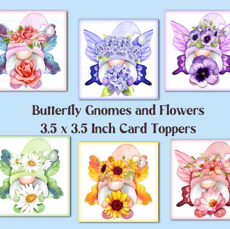 A set of six 3.5 inch square card toppers - Butterfly gnomes