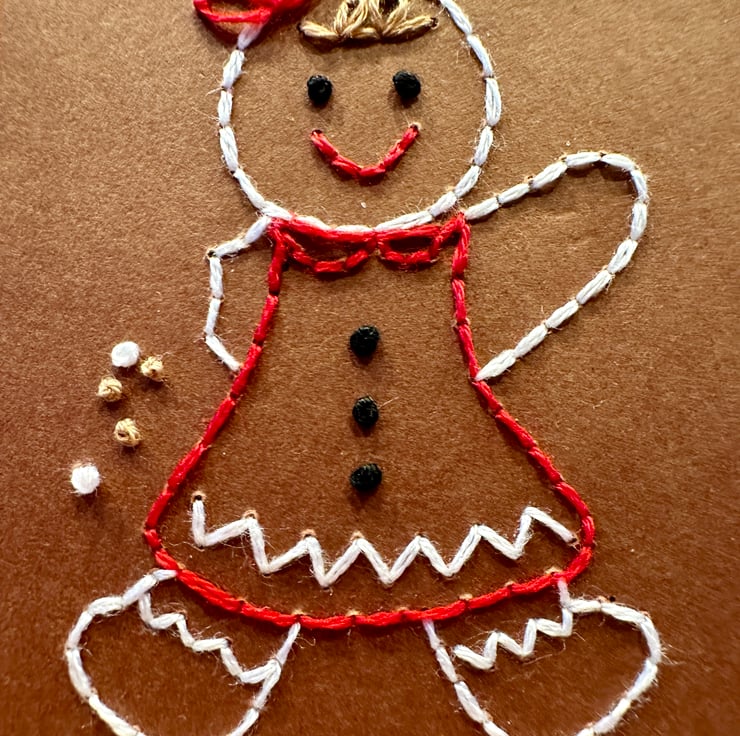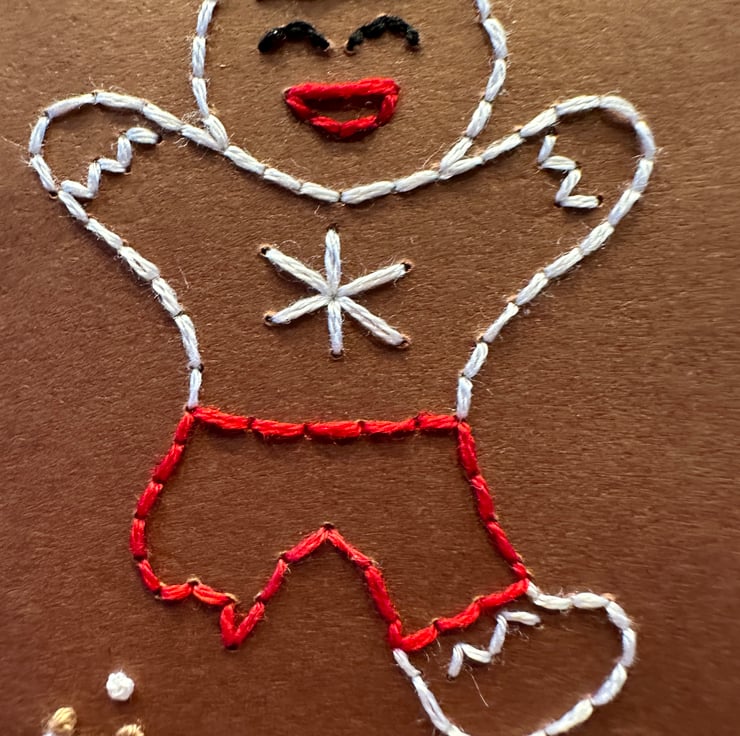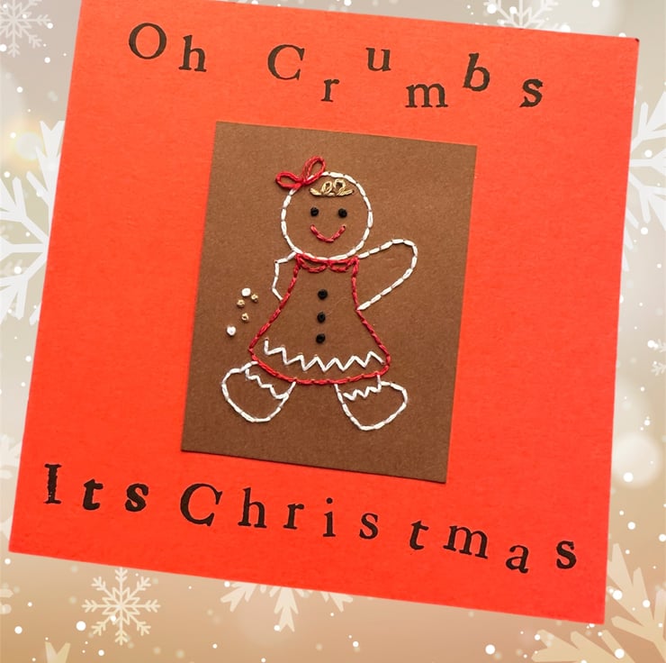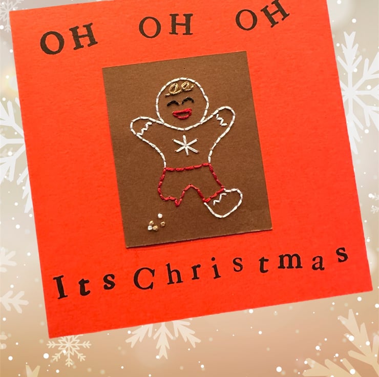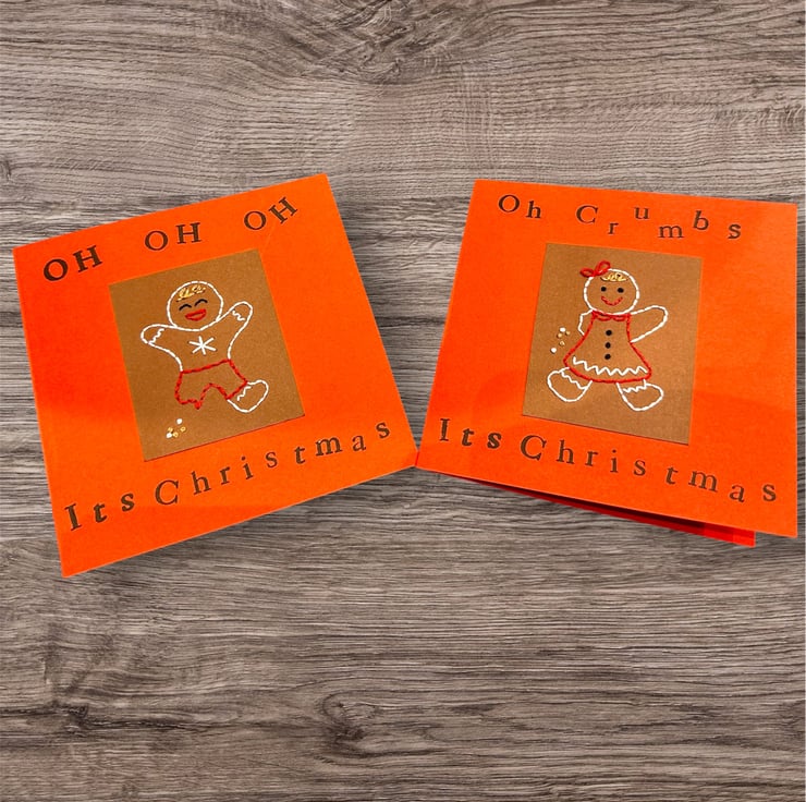 These unique cute gingerbread persons have been hand embroidered and sit on a thick brown card, which has then been mounted onto a quality deep red thick background card. The camera has made some pics appear more orange, they are the red of the photo of the back of the card.