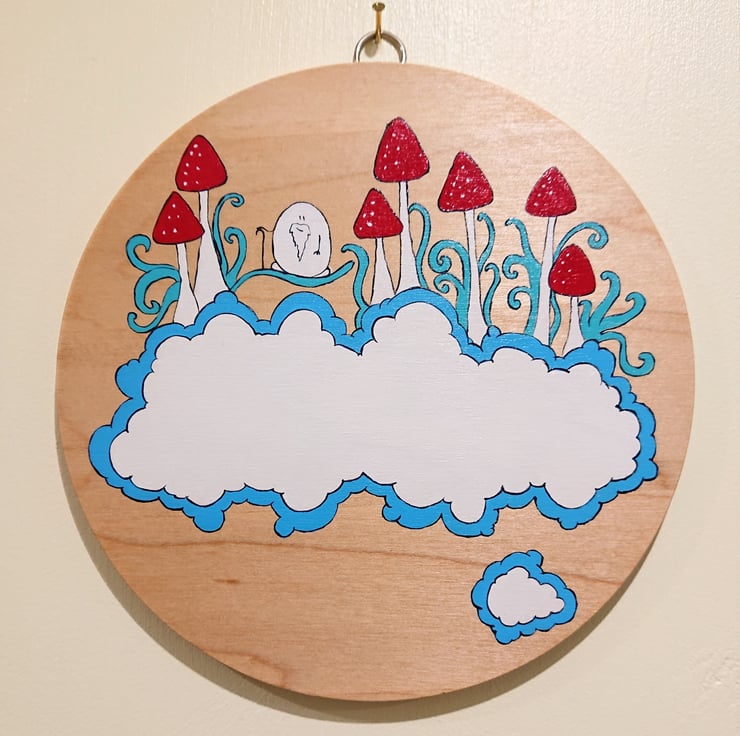 I love painting on wood and also drawing and painting mushrooms and clouds too, so wanted to create a piece to combine these things.