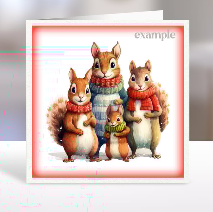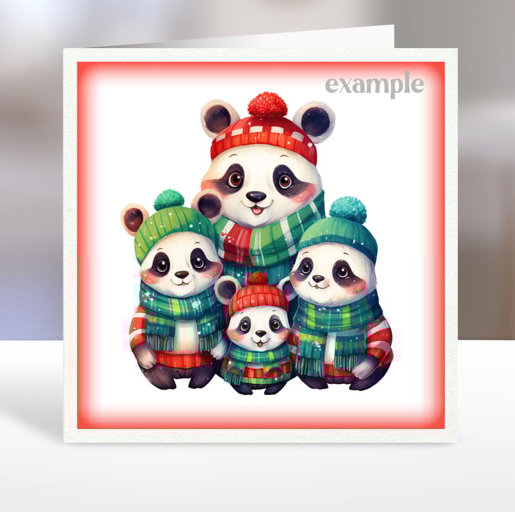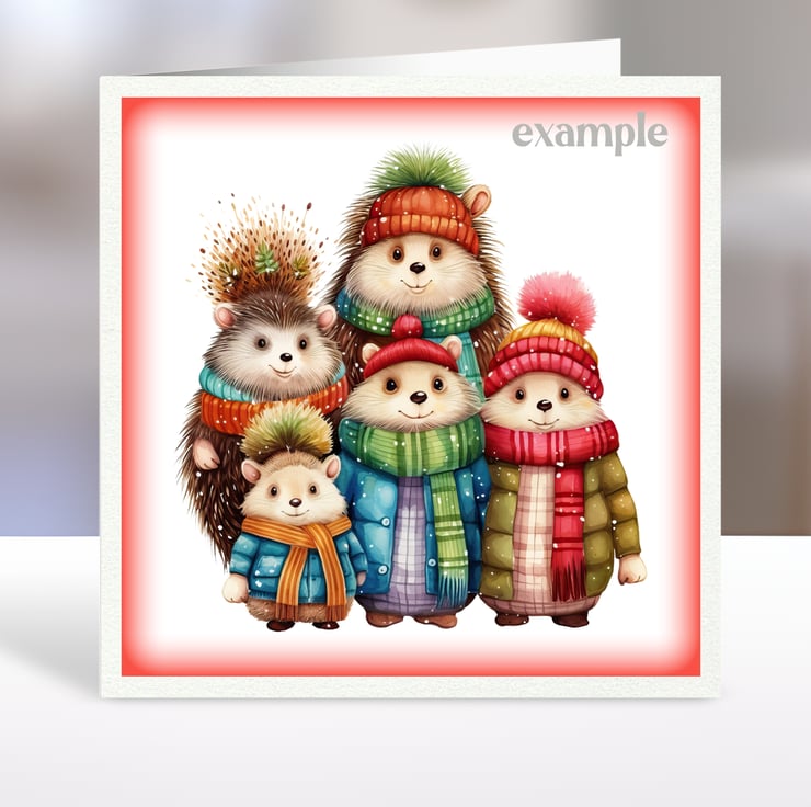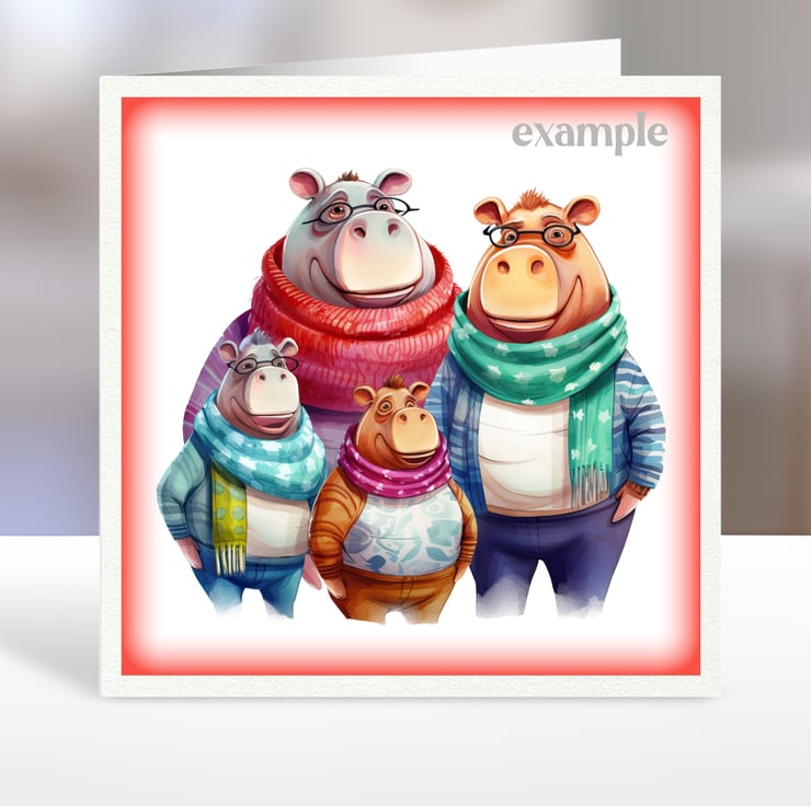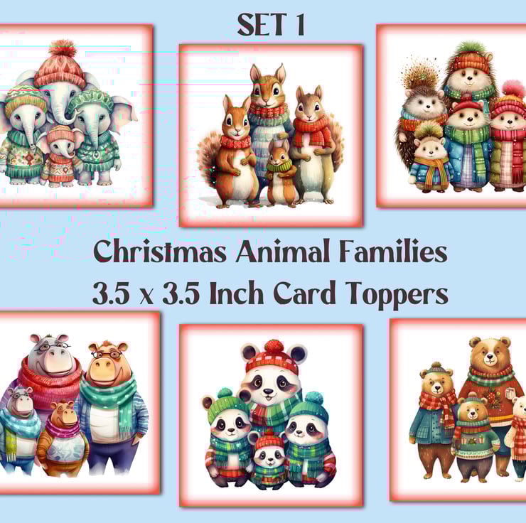 A set of six 3.5 inch square card toppers - Christmas animal families with bears, pandas, hedgehogs, hippos, squirrels and elephants. These adorable animal families are wrapped up warm for Winter in colourful jumpers and scarves. Set 1 of 2.