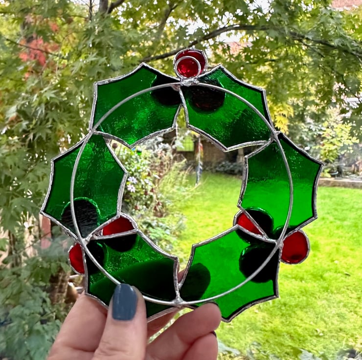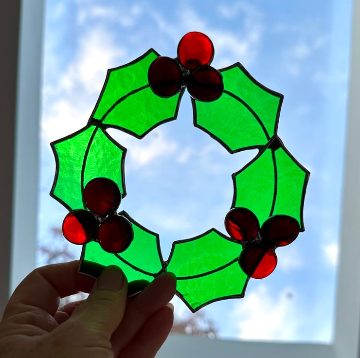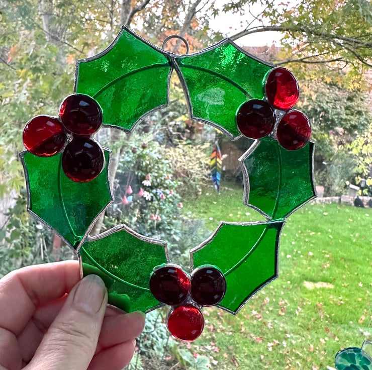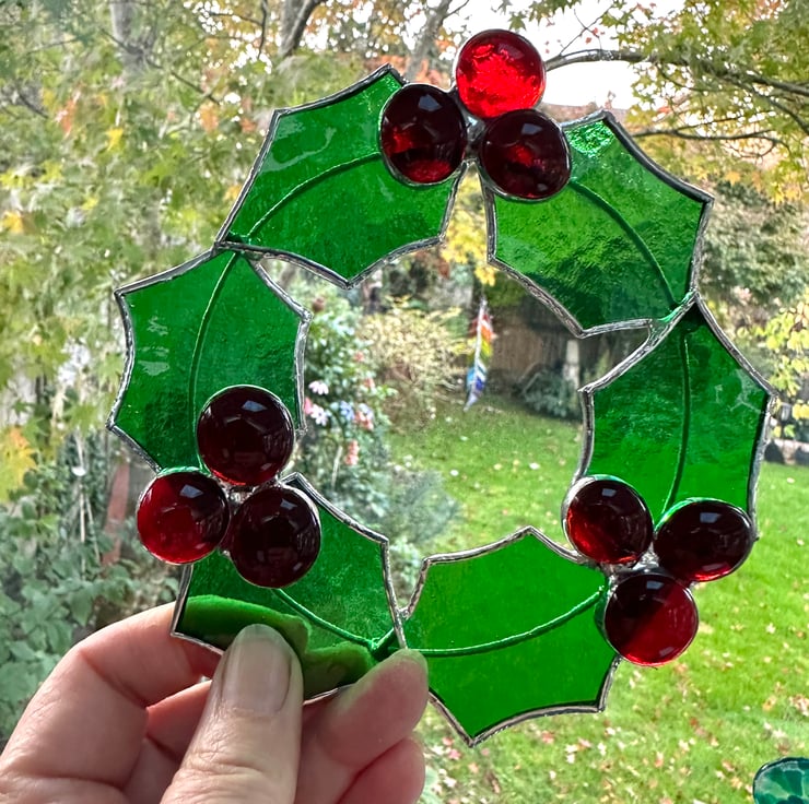 Each piece of glass has been cut by hand, ground, washed and foiled. The 6 leaves have been soldered to a tinned copper wire ring, 9 red glass nuggets have been used for the holly berries.