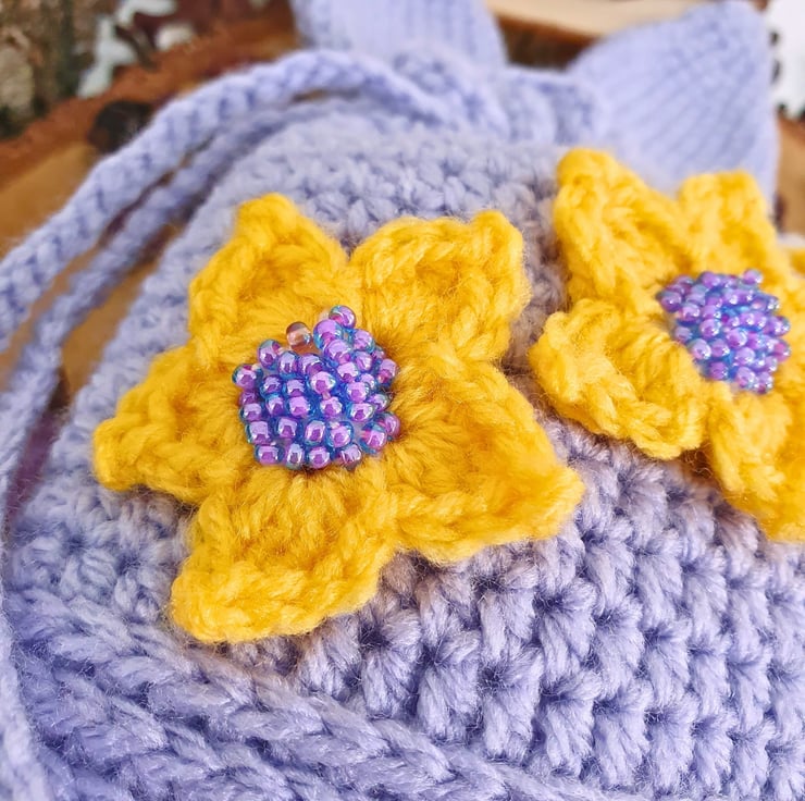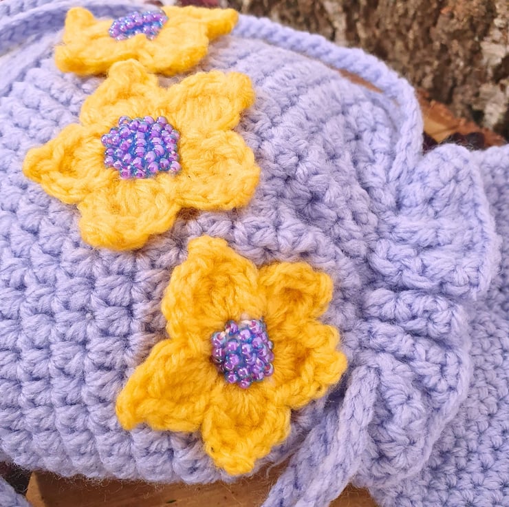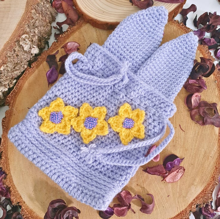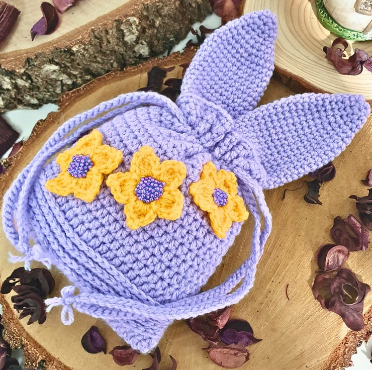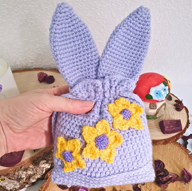 The pouch, bunny ears & strings are in Lavender Purple colour, with 3 yellow flower appliques on the main body. The flower centres are made with matching beads. (W) 14cm x (H) 15cm without the ears, (H) 23cm with the ears.