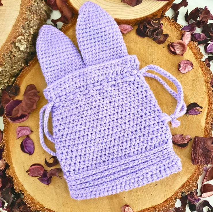 Handmade drawstring treat pouch / gift bag with bunny ears, crocheted with a 100% acrylic yarn. Reusable & eco-friendly, perfect as a favour bag & for gifting chocolates, sweets or small items.
