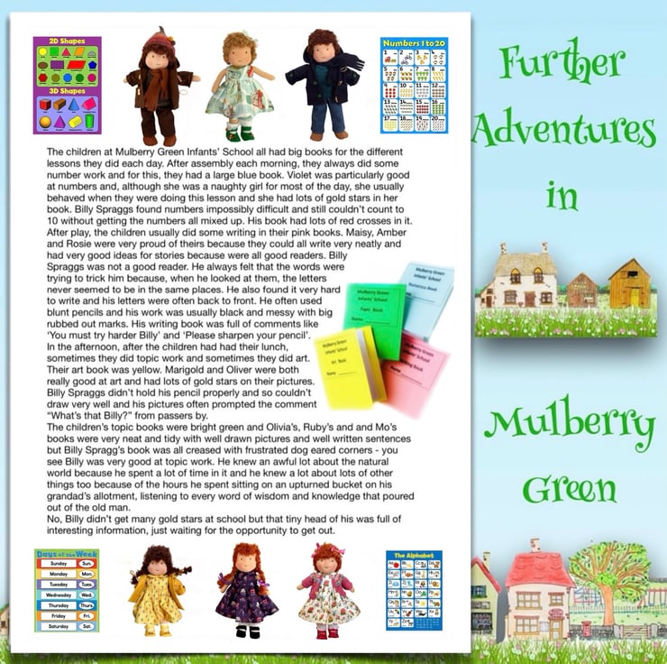There are other children in Maisy’s class at school - Violet, Billy with his pet rabbit, Amber, Tilly, Rosie and her kittens, Amelia, Ruby, Marigold, Bobby with Max the dog, and the twins Oliver and Olivia, who have a puppy called Oscar. The dolls are all 28cm tall and baby Daisy is 16cm. Maisy and Mo love nothing more than having adventures with their friends. You can read about their adventures on my Facebook and Instagram pages - Maisy Muffin Rag Dolls and on my Mulberry Green Pinterest boards.