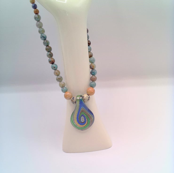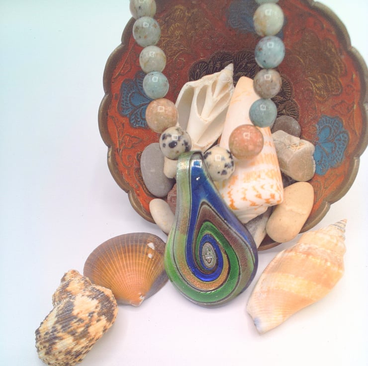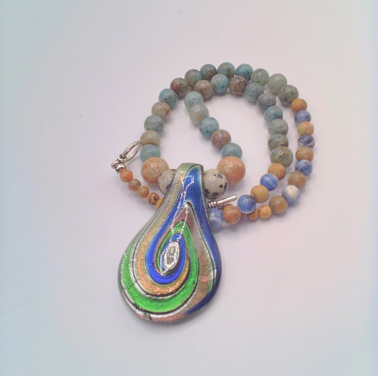 This stunning necklace look great for a Summer's day out or an evening get together with friends. It would also make a great gift for a special lady. The stunning glass pear drop shaped pendant necklace, with green, gold and blue swirls measures 55 mm from top to bottom and it is suspended on a pretty colourful mixed gemstone necklace. The gemstones include chrysocolla, wood jasper, sodalite and dalmation jasper. The necklace is fastened with a silver plated toggle clasp. The necklace is 17 inches (43 cm) in length. The necklace will be dispatched wrapped in tissue paper in an organza bag and delivered to you via Royal Mail first class post.