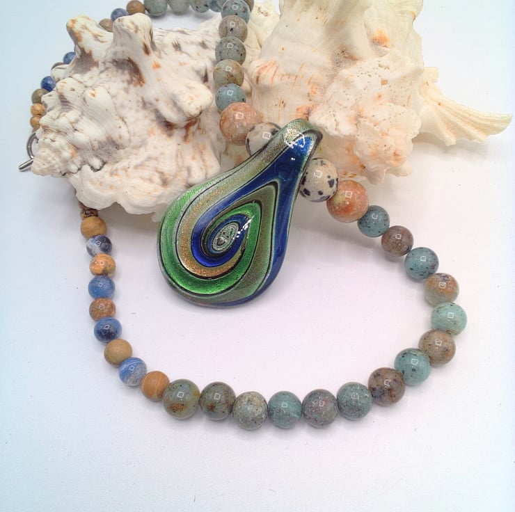 Glass Pendant with Blue Green and Gold Swirls on a Mixed Gemstone Necklace, Glass Pendant, Mixed Gemstone Necklace, Birthday Gift, Anniversary Gift, Gift for Her, Mother's Day Gift, Blue and Green Pendant