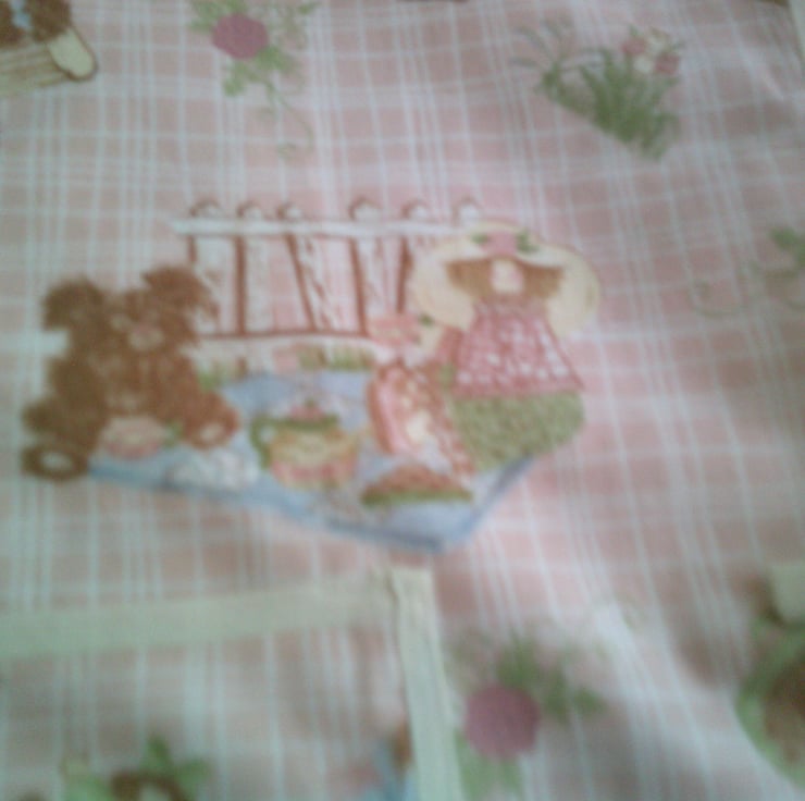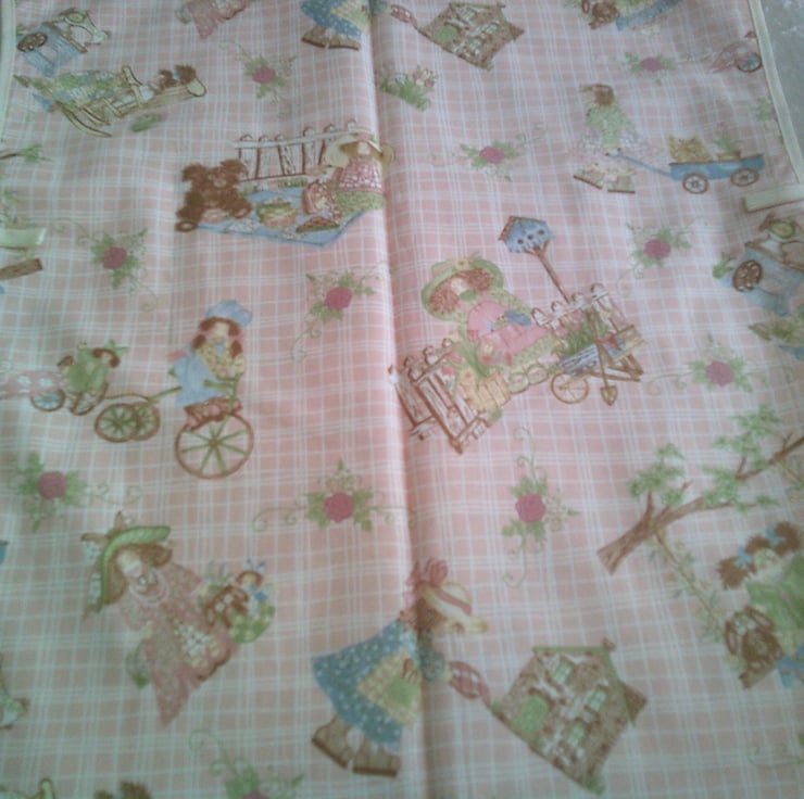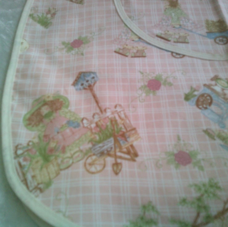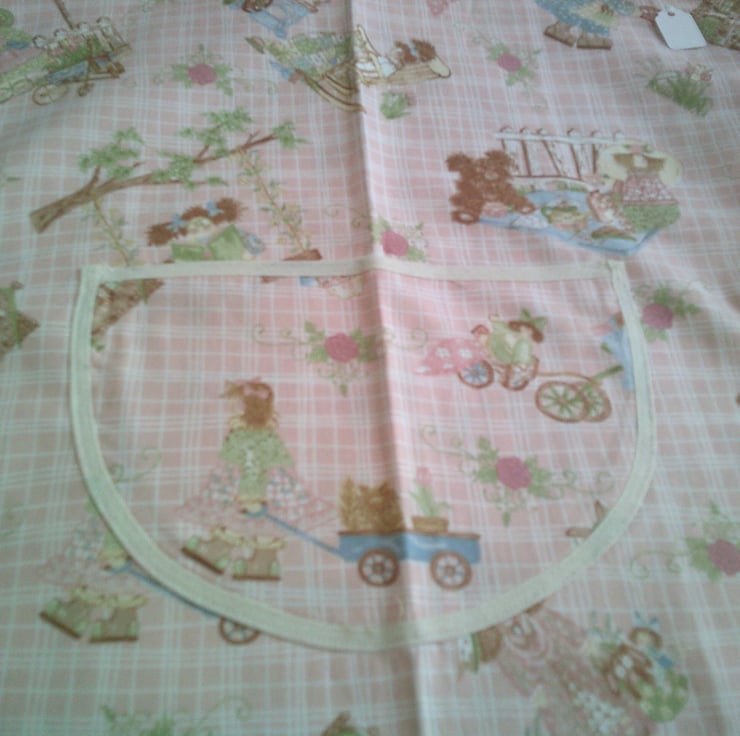 This child's tabard is made using 100% cotton fabric and has a design of children in garden scenes on a pale pink background. It is edged with cream bias binding. There is a pocket on the front and ties on the sides