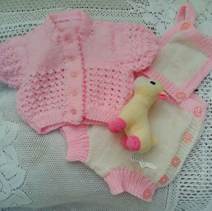 This set is in stock and is available in baby pink and white, as shown in the photos, to fit a 0 - 3 month old baby with a 16 inch chest size. It would make an ideal gift for a new born baby, a baby shower or as a Christening gift.