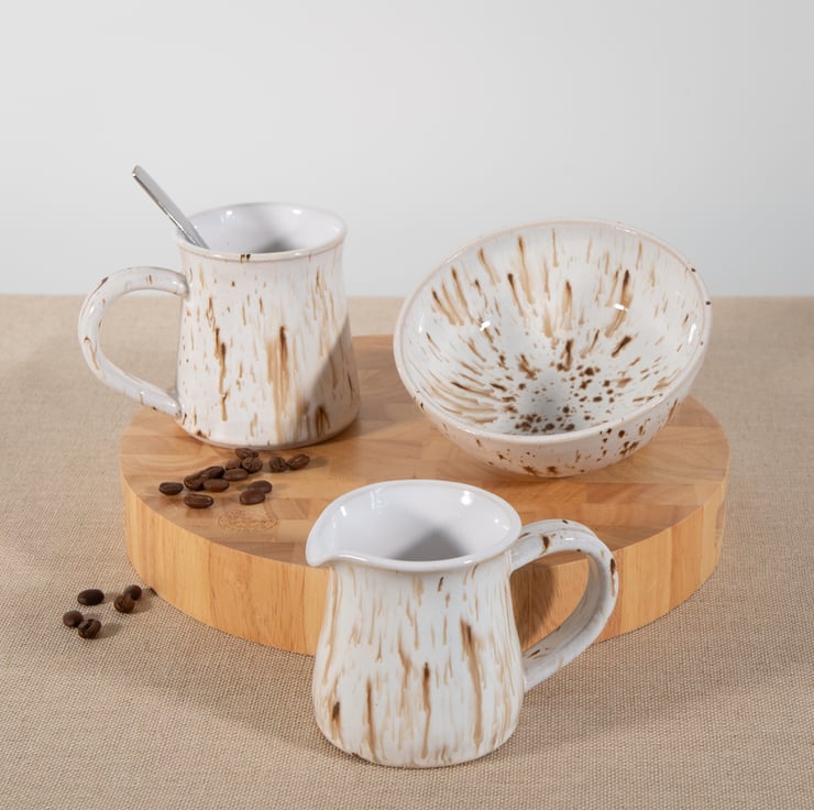 Finished all over with cream / white glaze with dripping brown streaks.