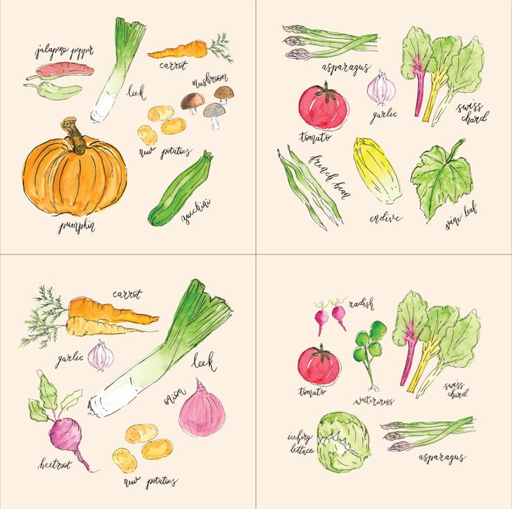 The set includes four designs, each showcasing a different set of vegetables illustrated in watercolour and ink, with a hand-written name label. Durable and stylish at 10x10cm and with a UV-resistant coating to help stop fading and marks.
