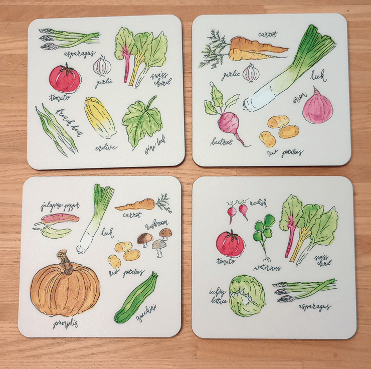 These coasters are part of my 'Eat your Veggies' collection, which also includes an A4 art print, a 100% organic cotton tea towel, square note cards, and a fridge magnet.