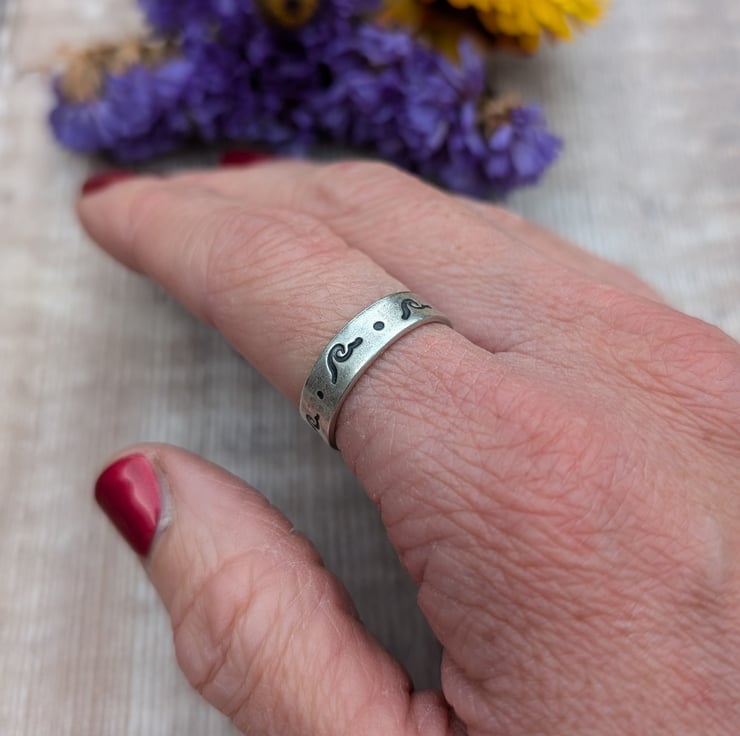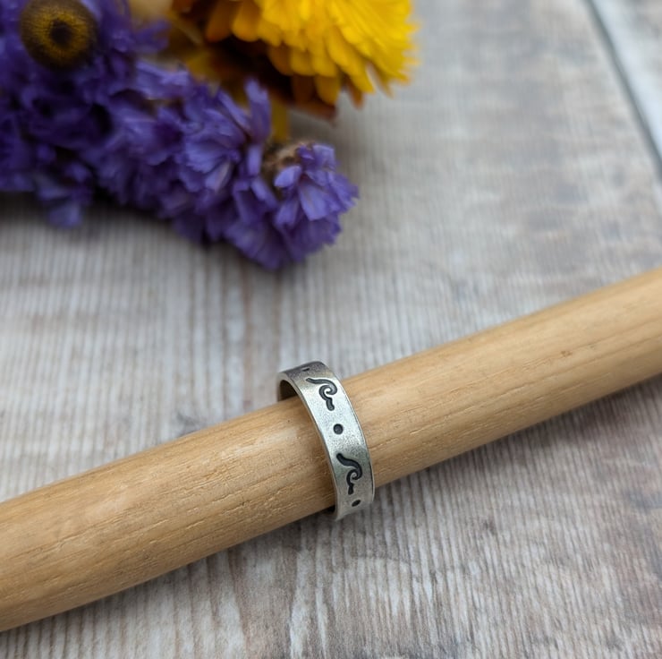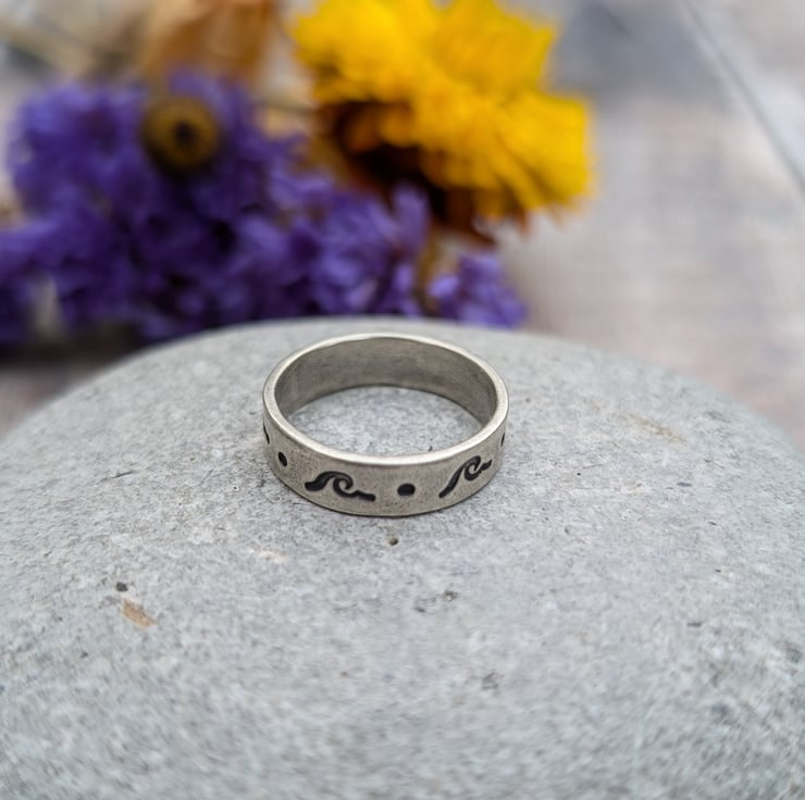 This distinctive ring features a wave-inspired stamped pattern along its surface, set in recycled sterling silver. The darkened details contrast beautifully against the matte silver, giving the ring a subtle yet eye-catching design.