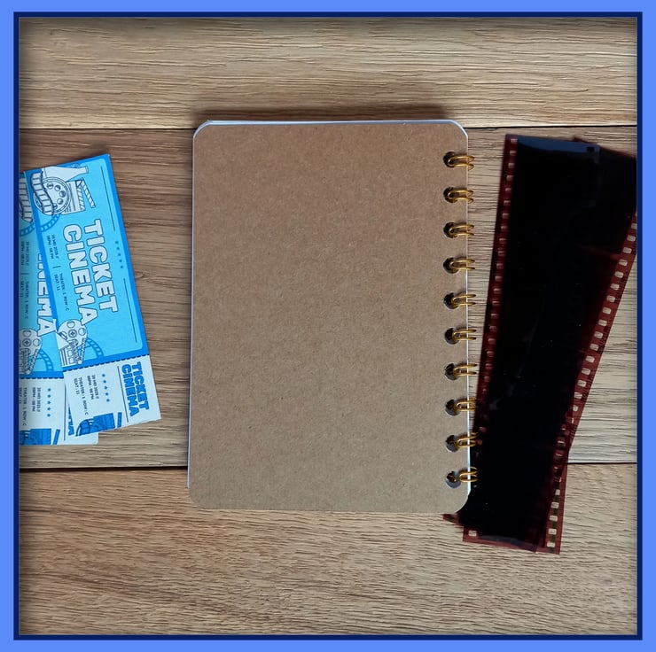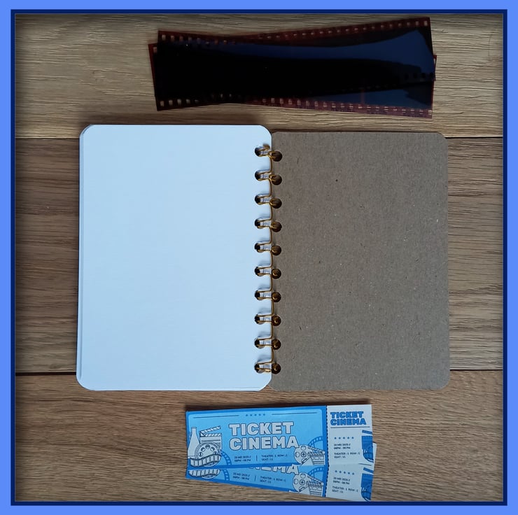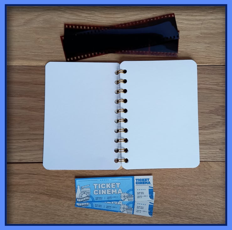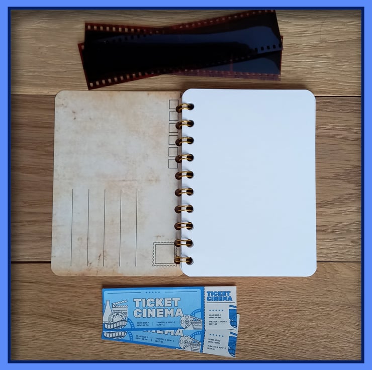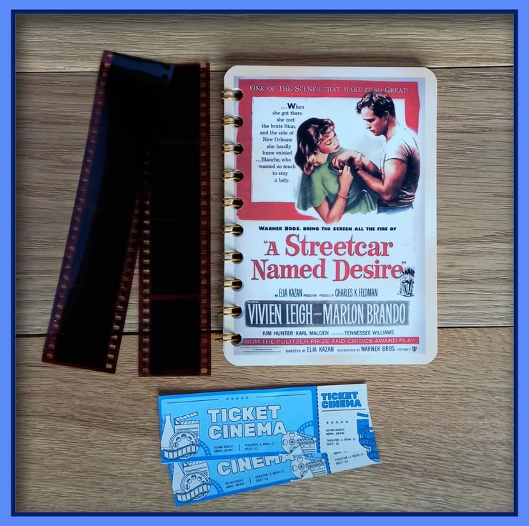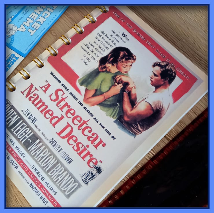 This wire bound Notebook has a front cover made from reproduction Postcard featuring a old mover poster of A Streetcar Named Desire Notebook, starring Vivien Leigh and Marlon Brando. There are 20 pages (40 sides) white cartridge paper, which have been sprial bound with Gold wire, the back cover is brown card. The over all size is 10cm wide by 14cm high, ideal size to pop in a coat pocket or bag, ready for you jot down notes or sketch. Great gift for a movie lover or movie buff, good size to pop into a Christmas Stocking