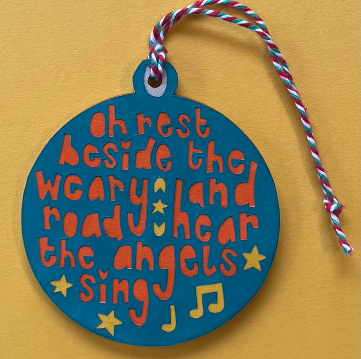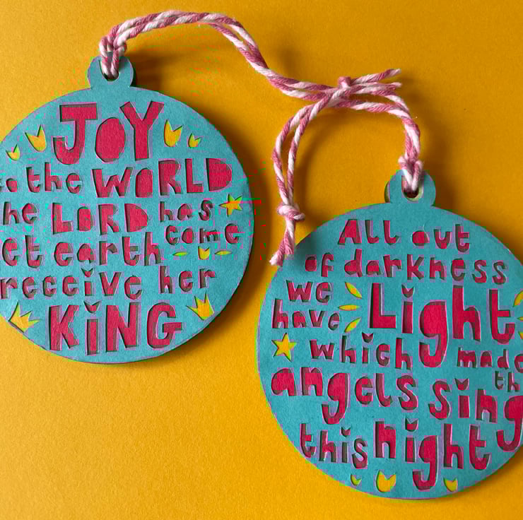 These decorations are fully designed and made by hand. The design is cut by hand into coloured paper and layered with contrasting paper to show the words and patterns. The papercut is then applied to a wooden bauble shape and varnished to protect it. Finally a length of colourful string is added.