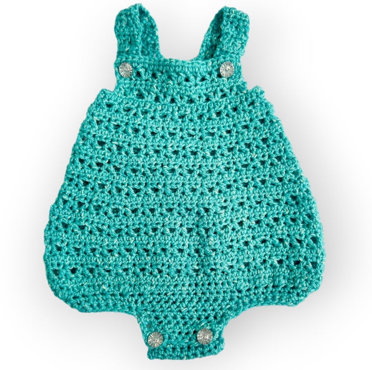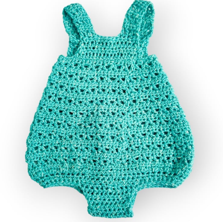 Your baby girl will look adorable and stay comfortable in this handmade teal crochet romper, designed for summer days and easy movement.