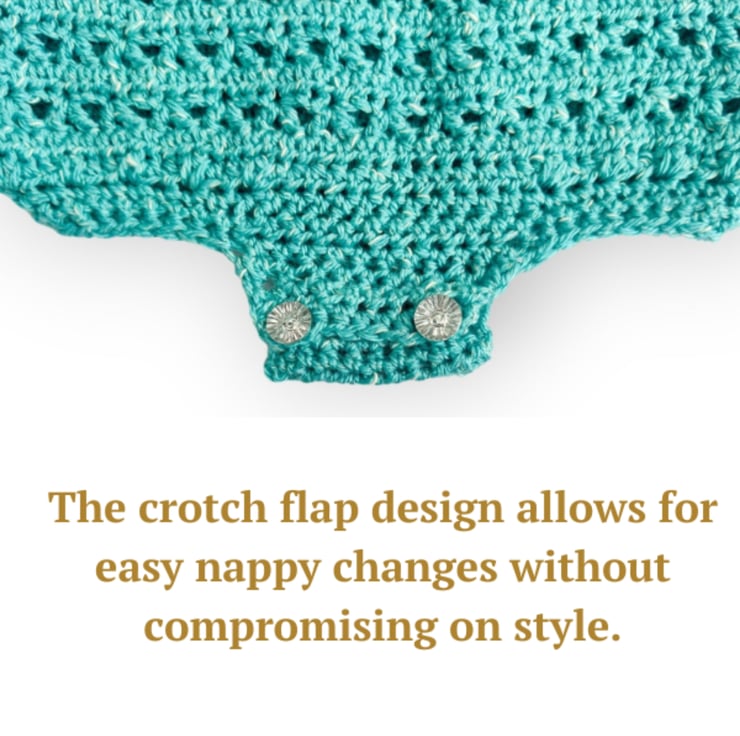 The crystal button fastenings, sewn on with invisible thread, make dressing and nappy changes a breeze, even with a wriggly baby!