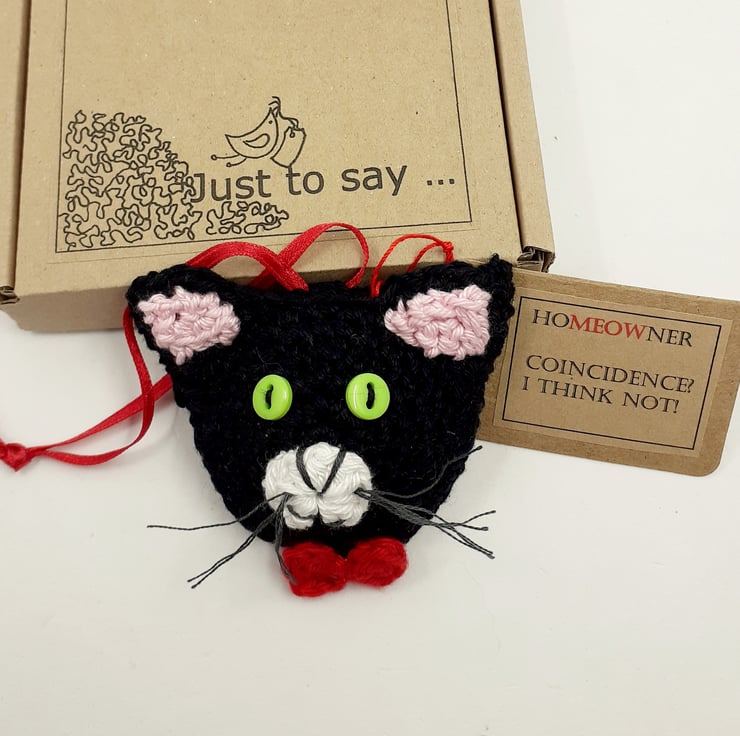 This smart kitty in his red bow tie is crocheted in cotton and lightly filled with polyester stuffing. He has green acrylic button eyes and there is a narrow ribbon hanging loop. The tag reads, Ho meow ner