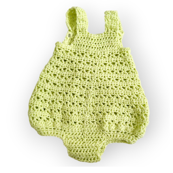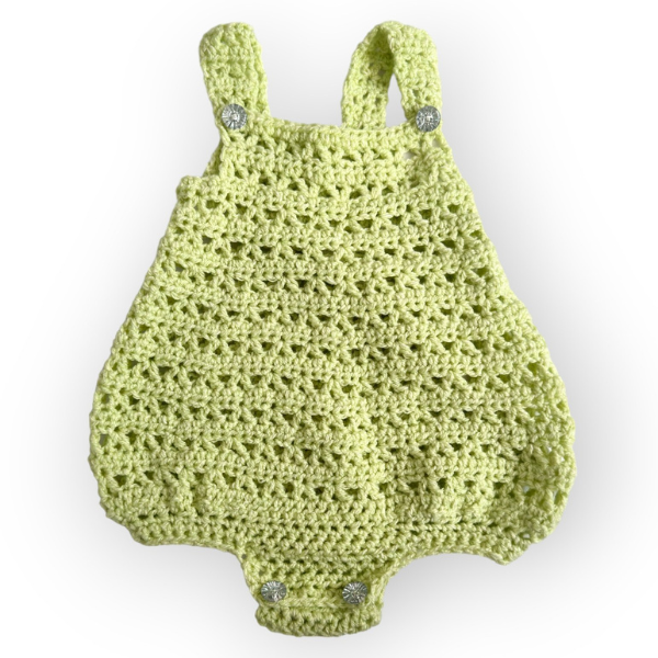 Keep your little one cool and stylish with this avocado green crochet baby romper, perfect for warm days.