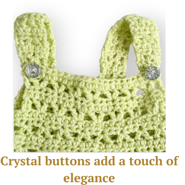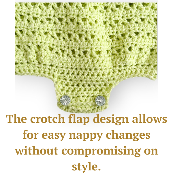 It’s practical too—whether your baby is wriggling or rolling around, the crystal button closures on the straps and crotch flap make dressing and nappy changes quick and easy.