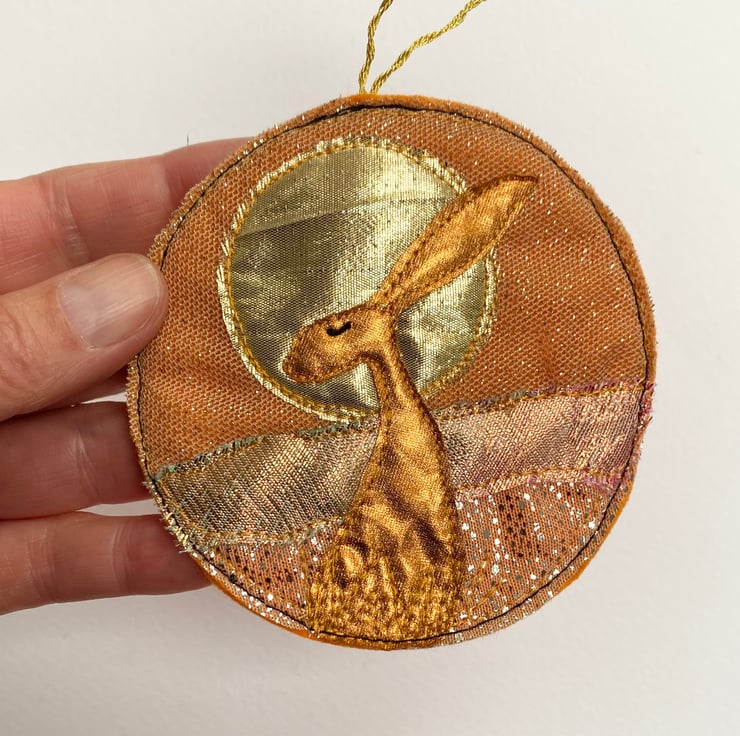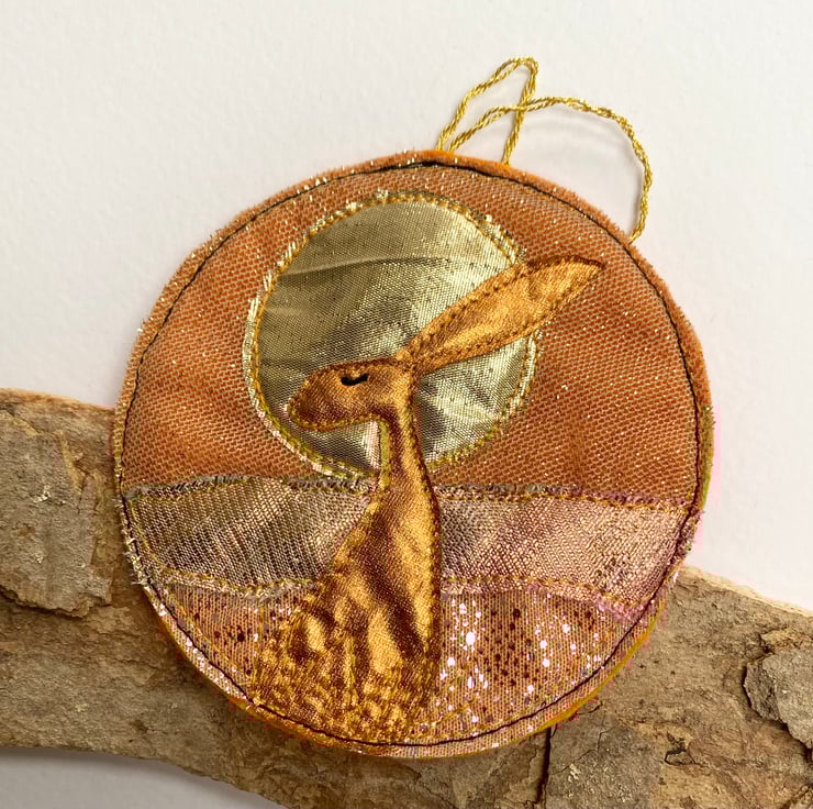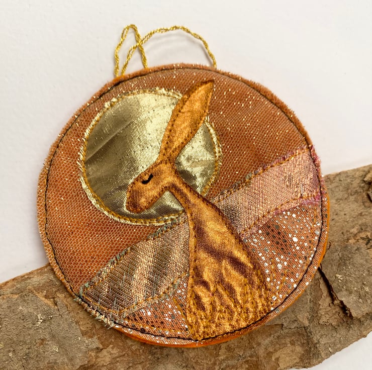 This charming embroidered hare home decorations shows a hare framed by a setting harvest sun. It has been made from up-cycled fabrics and stitched down with free motion embroidery. It comes felt backed and measure approx 9.5cm diameter, with the ribbon the length is 15.5cm.