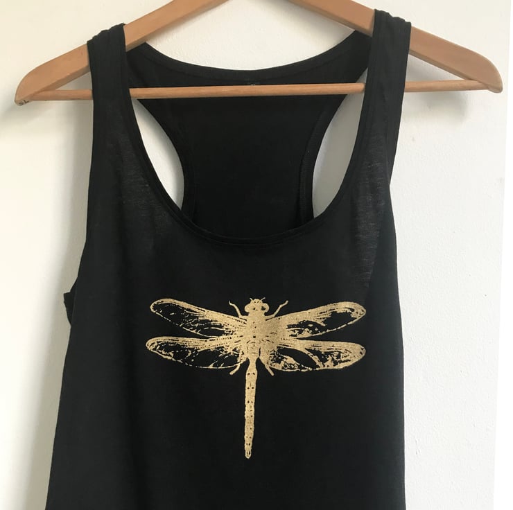 Gold Dragonfly Women's black vest, lightweight organic cotton.