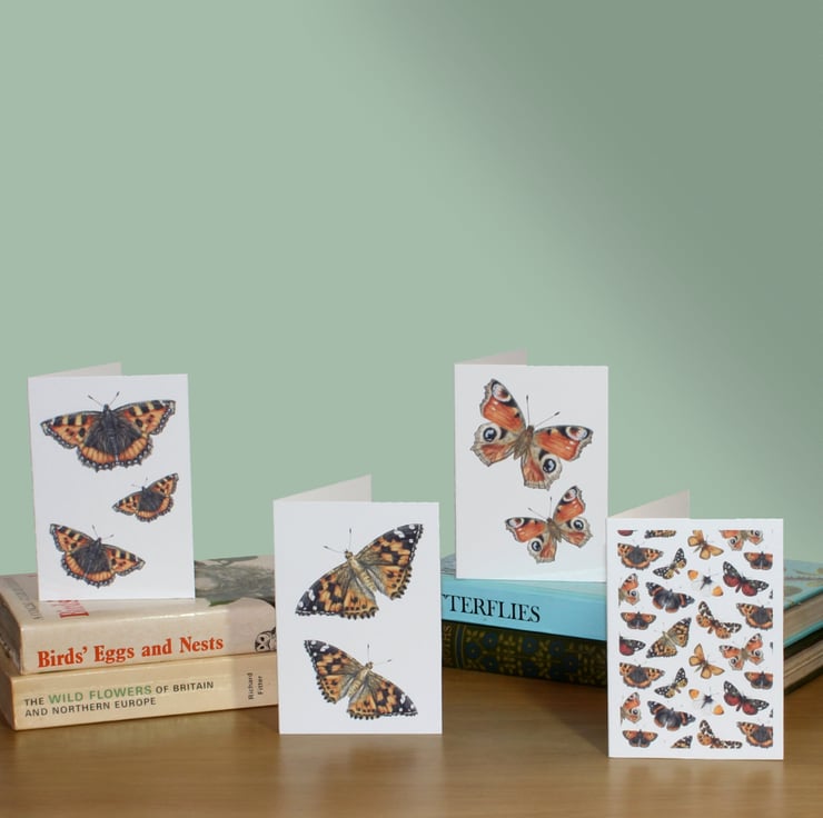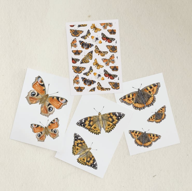 This is a set of four mini butterfly themed greetings cards, one each of Peacock, Painted Lady and Small Tortoiseshell butterfly designs and one with a kaleidoscope of butterflies. Each of the illustrations have come from my own hand painted watercolour nature paintings. They are great to use for little thank you notes or messages of hello. The set makes a lovely gift for lepidopterists, nature lovers and wildlife fans as well as those who love art.