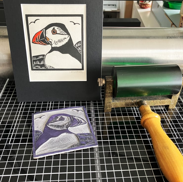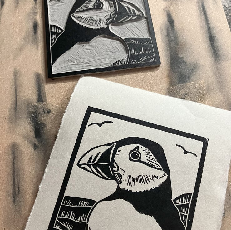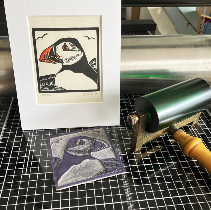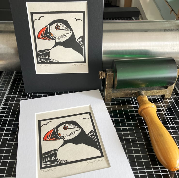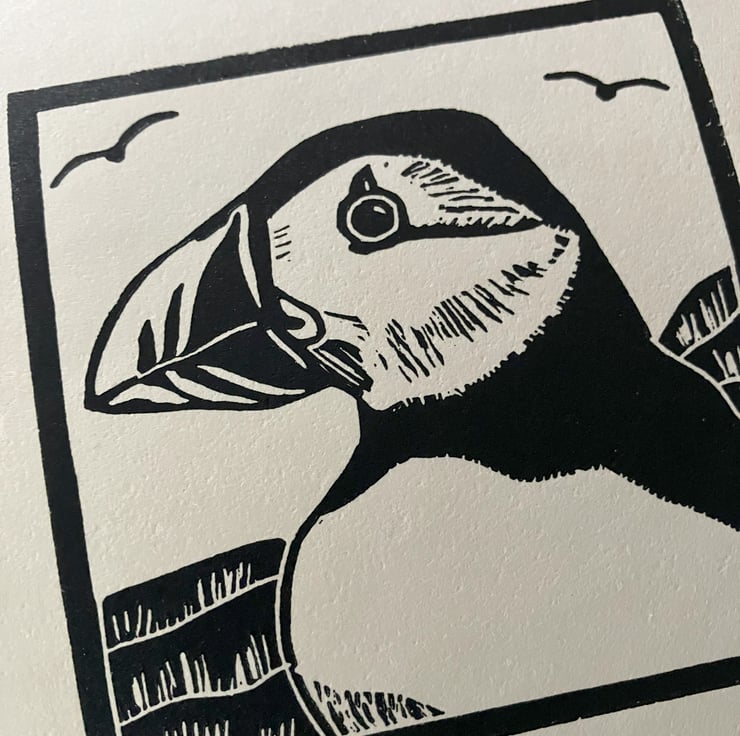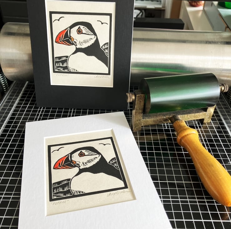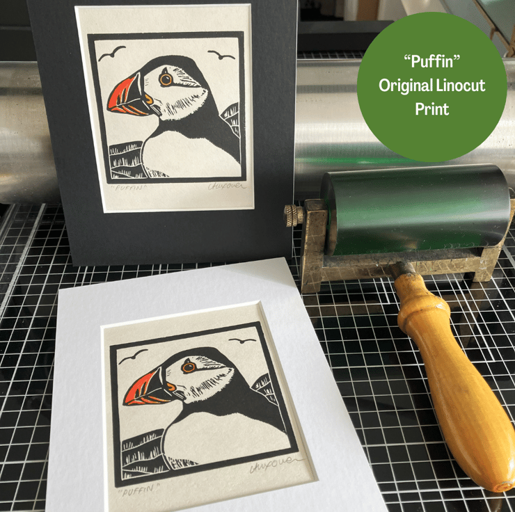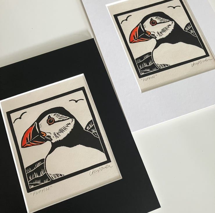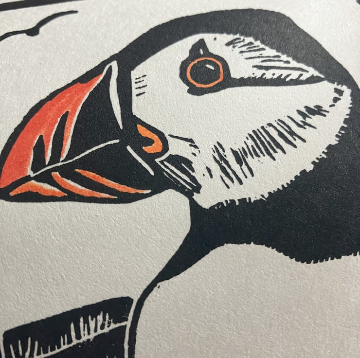 "Puffin" is created using the relief printmaking method of linocut printing. As each print is created by hand and hand finished with watercolour, there may be tiny variations which add to the individual beauty of each original artwork. "Puffin" is printed on Okawara Pro Roll 70gsm printmaking paper by Awagami Factory.