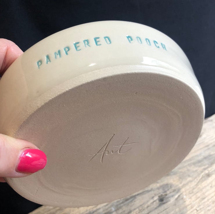 An off-white thrown stoneware bowl with hand stamped PAMPERED POOCH text which has had turquoise underglaze worked into the stamped text for clarity.