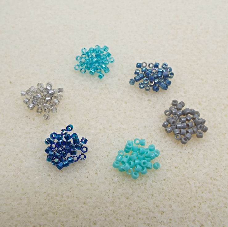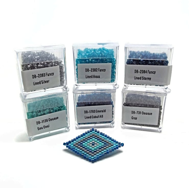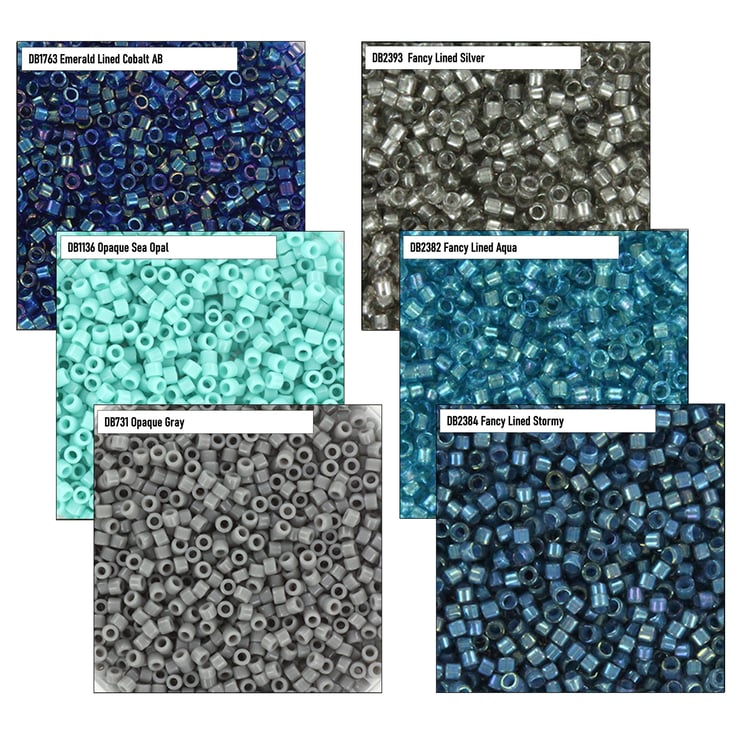DB-1763 Emerald Lined Cobalt AB, DB-2382 Fancy Lined Aqua, DB-731 Opaque Gray, DB-1136 Opaque Sea Opal, DB-2393 Fancy Lined Silver, DB-2384 Fancy Lined Stormy