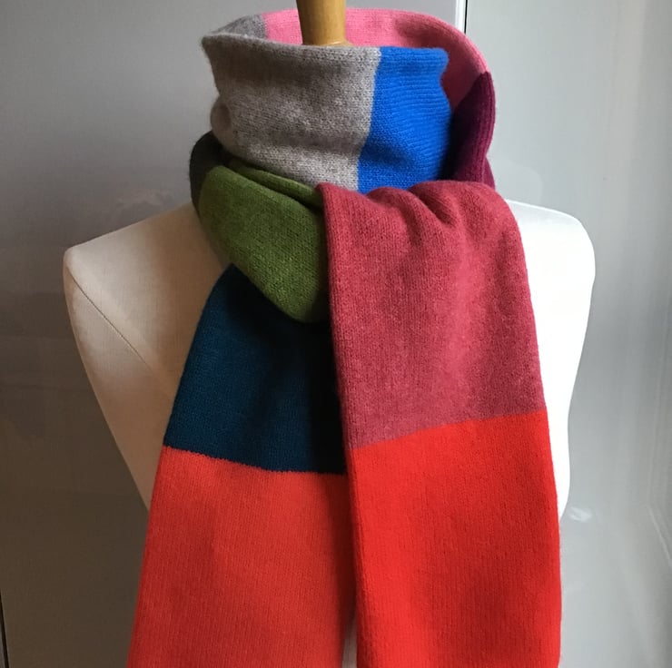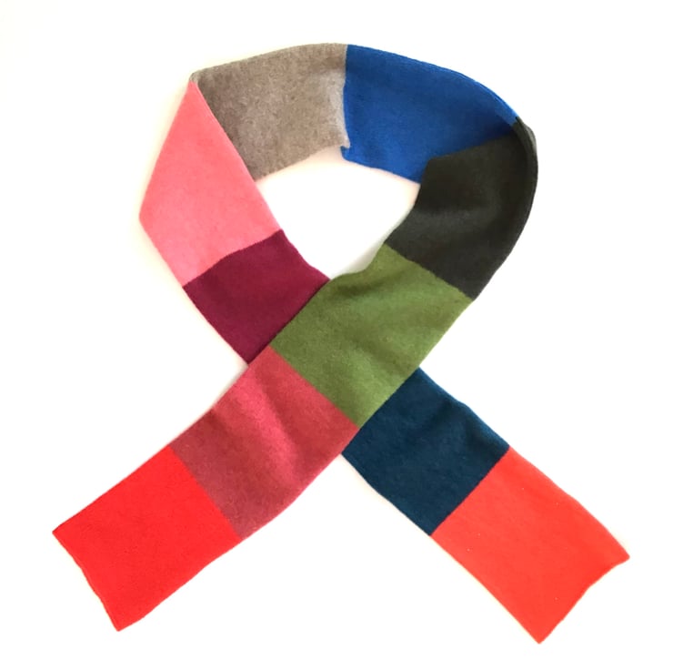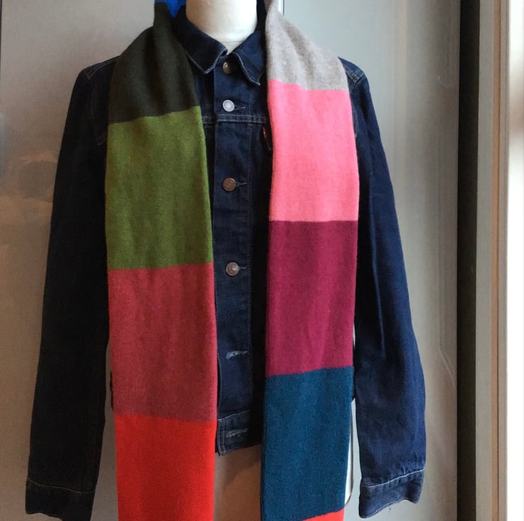 The scarf is handcrafted on a vintage knitting machine in our studio in Greenwich, London and hand finished. It is gently washed, very lightly felted and sewn to achieve a warm scarf.