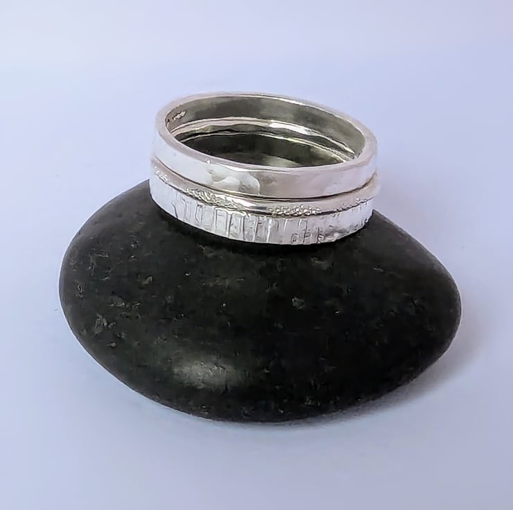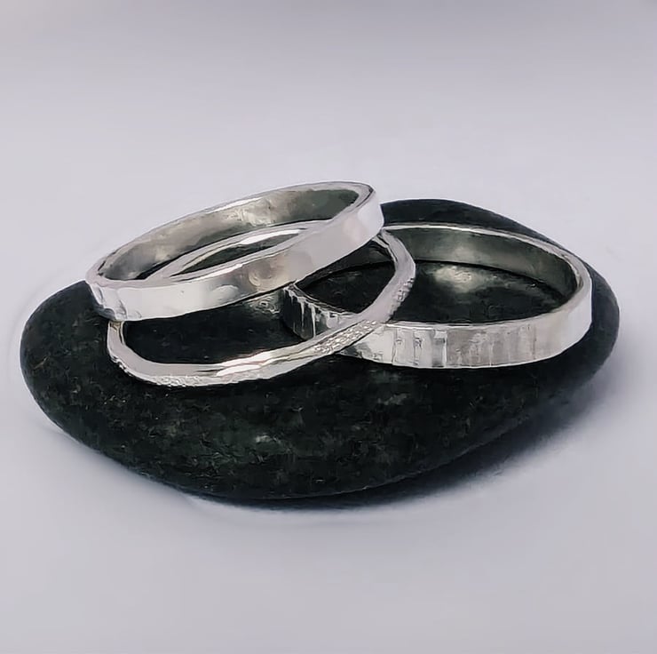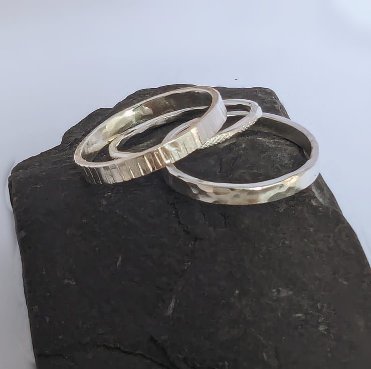 2 mm wide Bark textured, hand stamped on to the ring. And a 1.3 wide dash textured ring