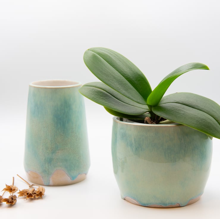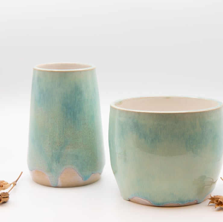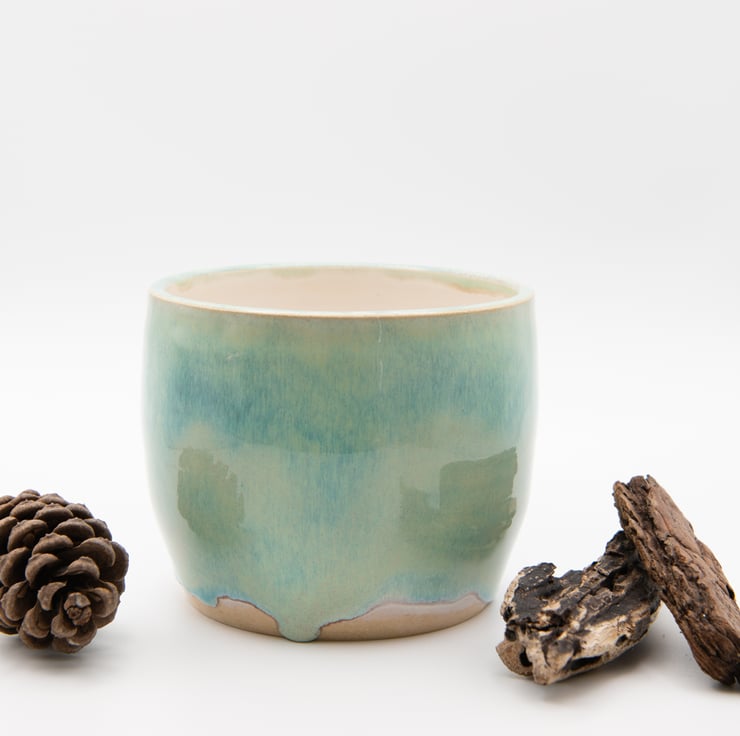Finished inside with a white glaze and on the outside with a combination of glazes which break turquoise-green and flow-drip towards the bottom