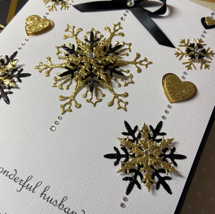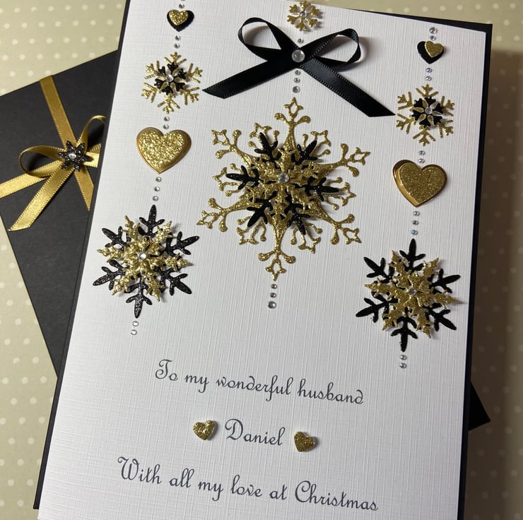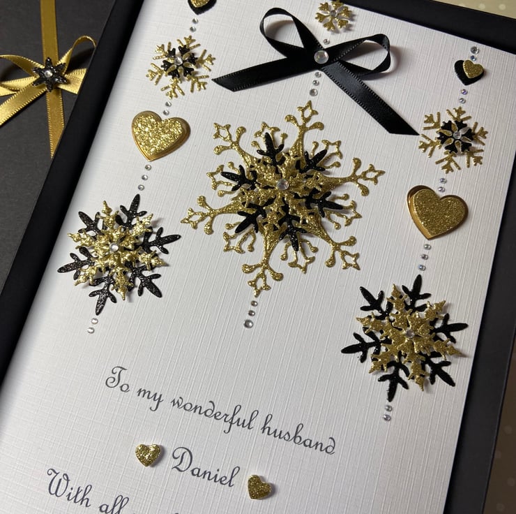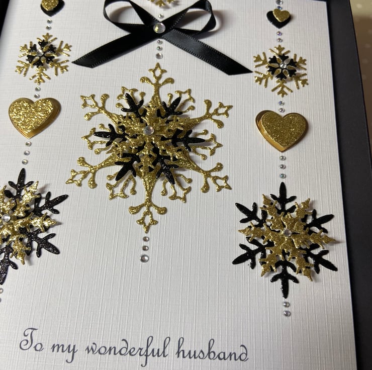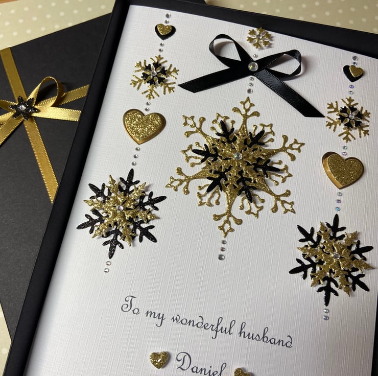 This handmade personalised Christmas card is A5 in size ( 210mm x 150mm) and is on 300gsm heavyweight linen card. The card can be for an individual or a couple and the text underneath the snowflakes can be personalised for you.