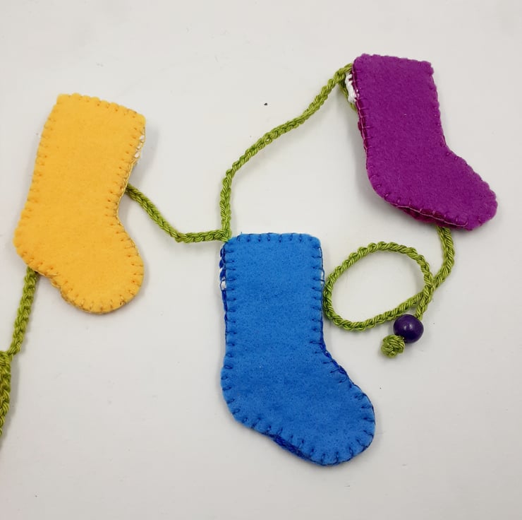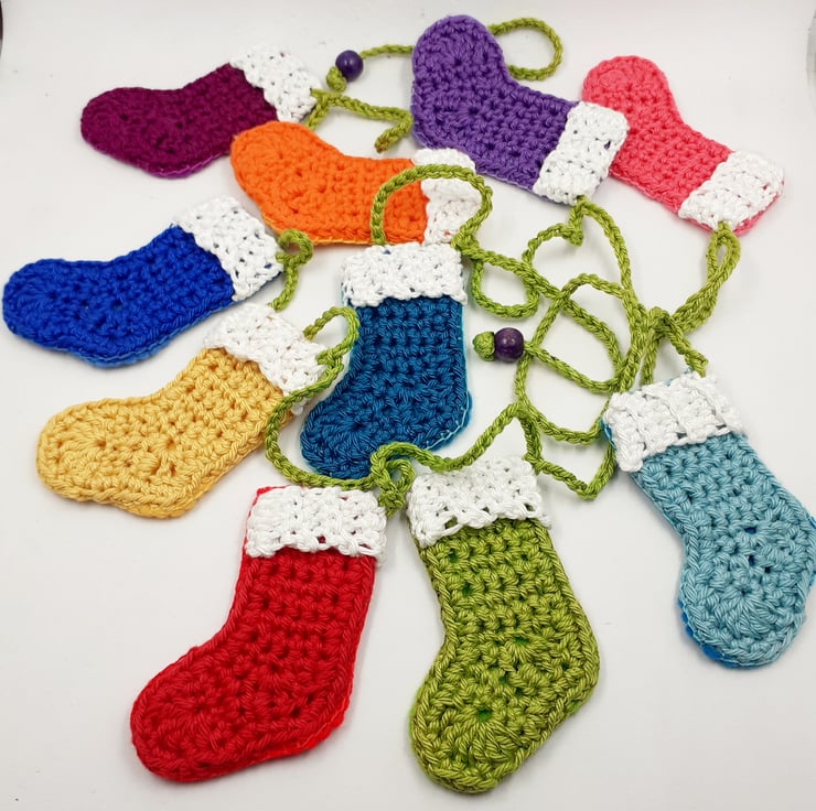 Merry and Bright, this festive garland features 12 stockings crocheted in 12 cheerful colours with a white cuff. The stockings are backed with stiffened felt and attached to a green cotton 'string. Each stocking measures approximately 7cm from top to bottom and the whole garland measures approximately 148cm in length. There is a painted wooden bead at either end for easy tying.