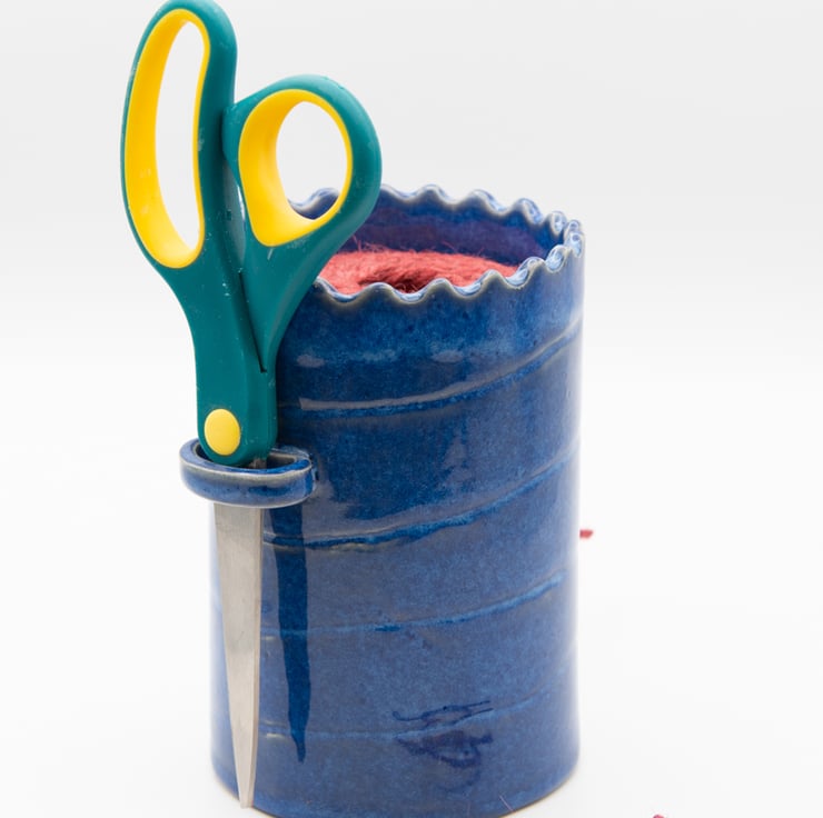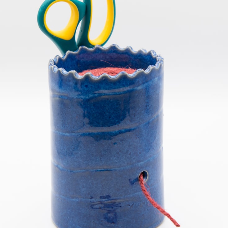 Upper edge scallop carved, with scissor holder and pierced to dispense string (scissors and twine not included).