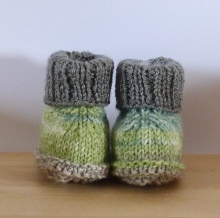 A pair of hand knitted booties in green variegated and charcoal grey yarns. The sole and foot is in green and the turn down cuff is charcoal grey. They measure approximately 10cm (4") from heel to toe with plenty of stretch.