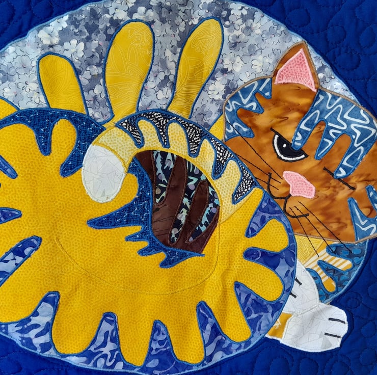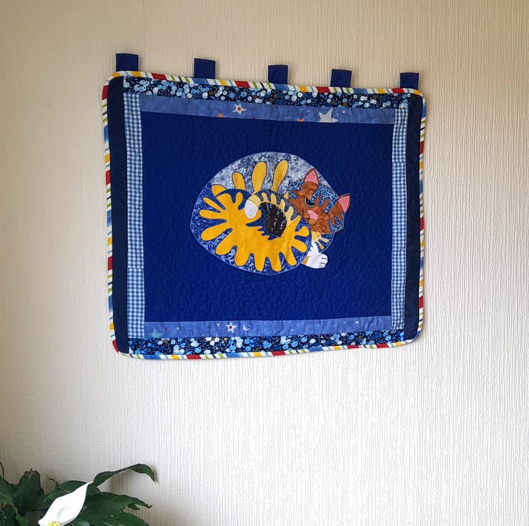 This Wall Hanging features at its centre, a unique, applique, depiction of a curled up snoozing cat. The applique consists of many cotton and poly cotton fabrics in shades of blue, white, yellow and brown.