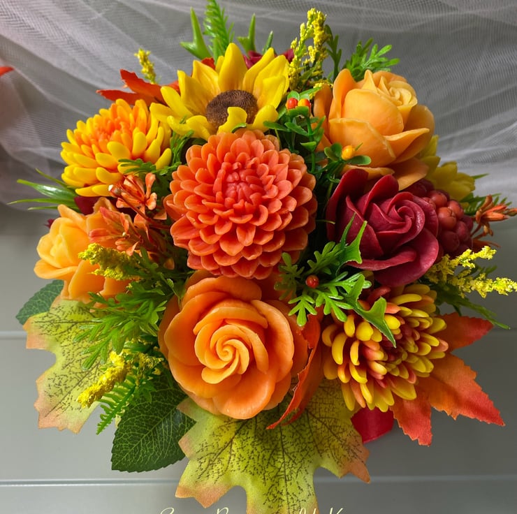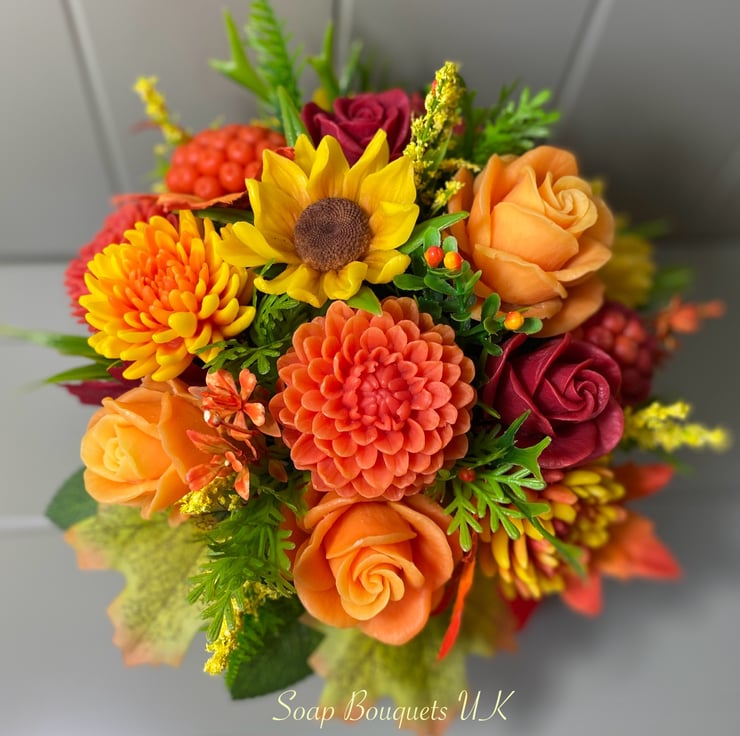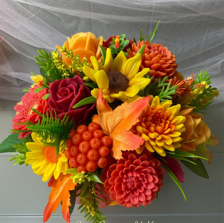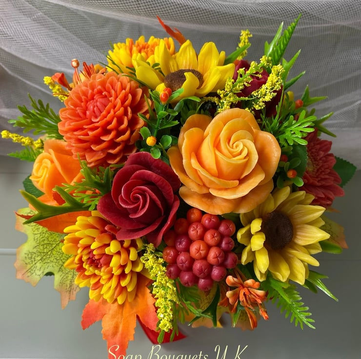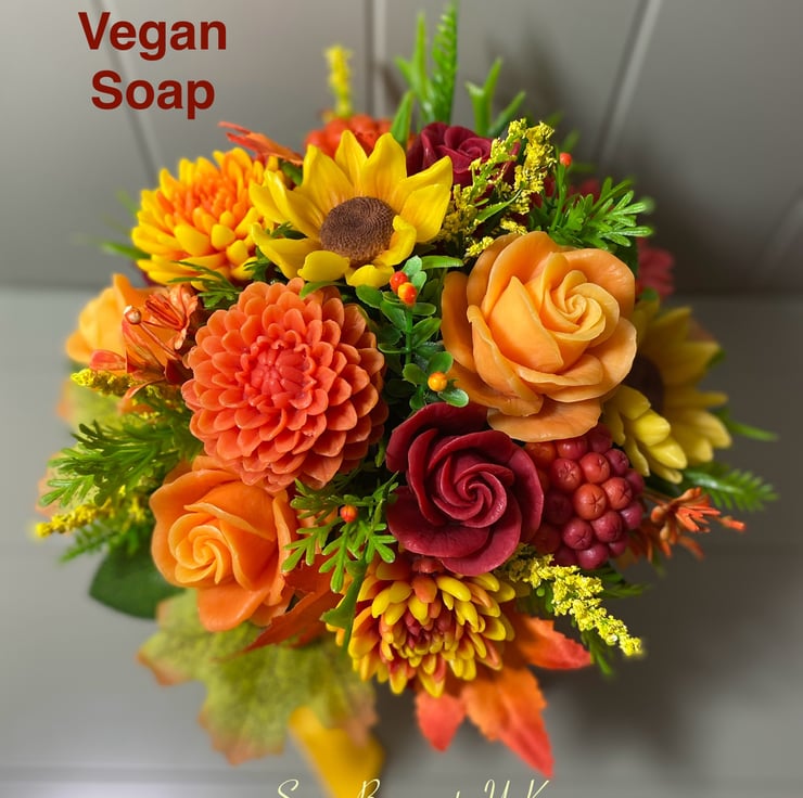 This gorgeous autumn-themed soap flower bouquet is a perfect mix of elegance and function! Each bloom is carefully handcrafted from vegan, cruelty-free soap, offering a luxurious spa-like experience with every use. The bouquet showcases roses, dahlias, chrysanthemums, sunflowers, gerberas, and rowan berries, capturing the rich colors of fall for your home decor.