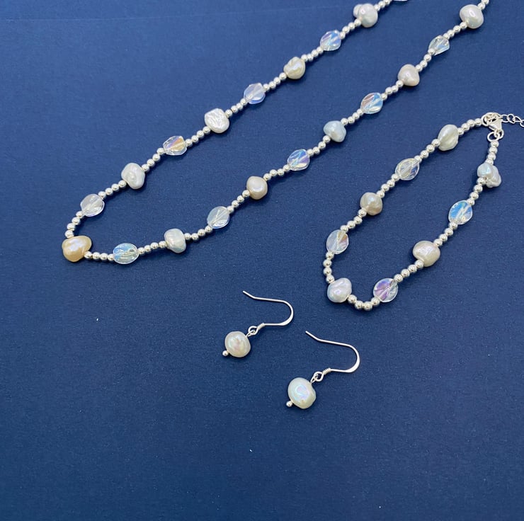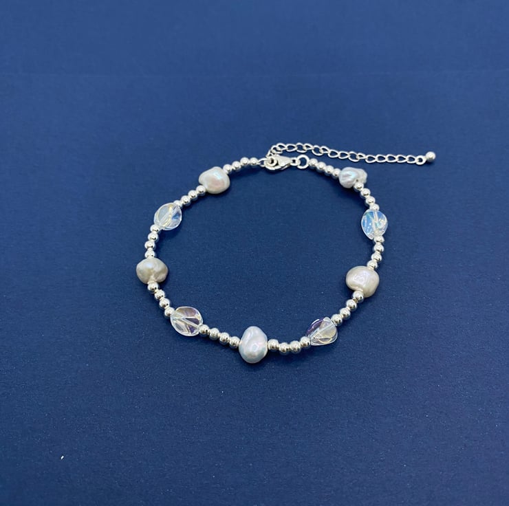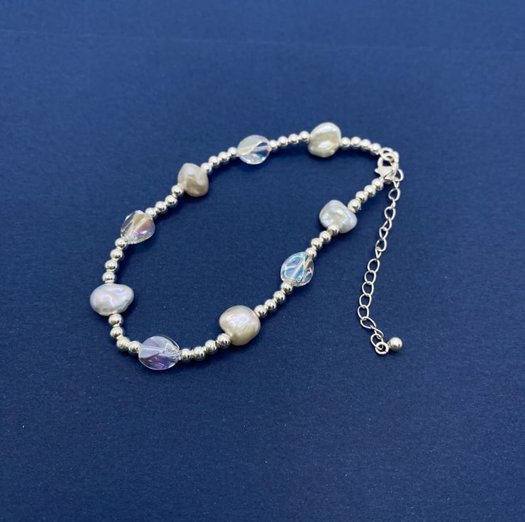 This colorful Keshi freshwater pearl bracelet features unique, irregular-shaped pearls combined with sparkling artificial crystal beads and sterling silver beads. The playful mix of textures and colors creates a vibrant accessory that adds charm to any outfit. Adjustable and comfortable, it’s perfect for both casual and formal occasions.